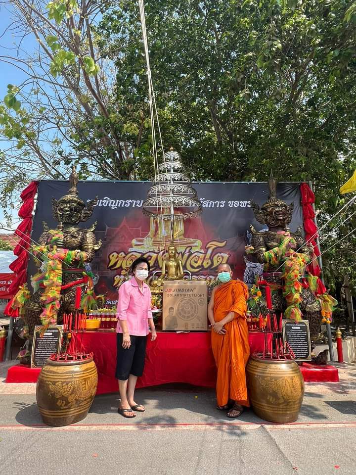 นางสมจิตต์ แต่งสมุด พร้อมครอบครัว เดินทางมาที่วัดเสาธงทอง มามอบโคมไฟระบบโซล่าเซลล์จำนวน 1 ชุดชุดละ 2,800 บาท