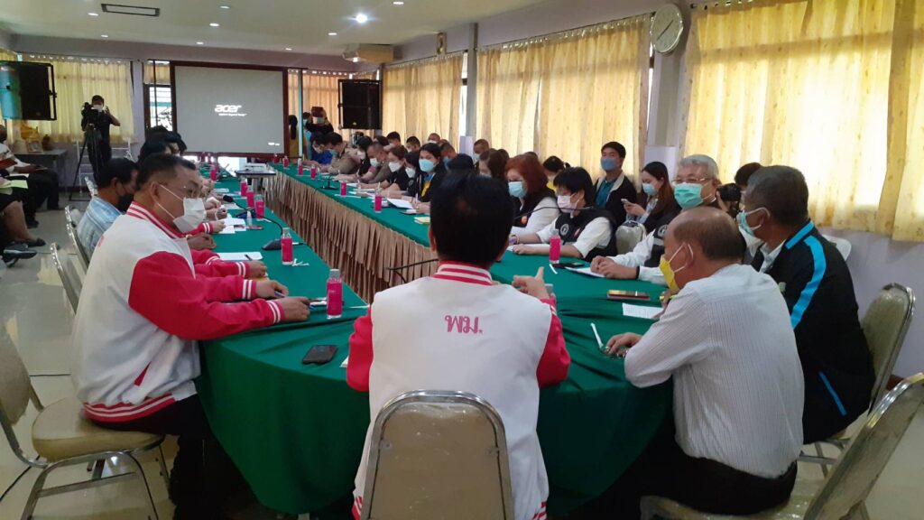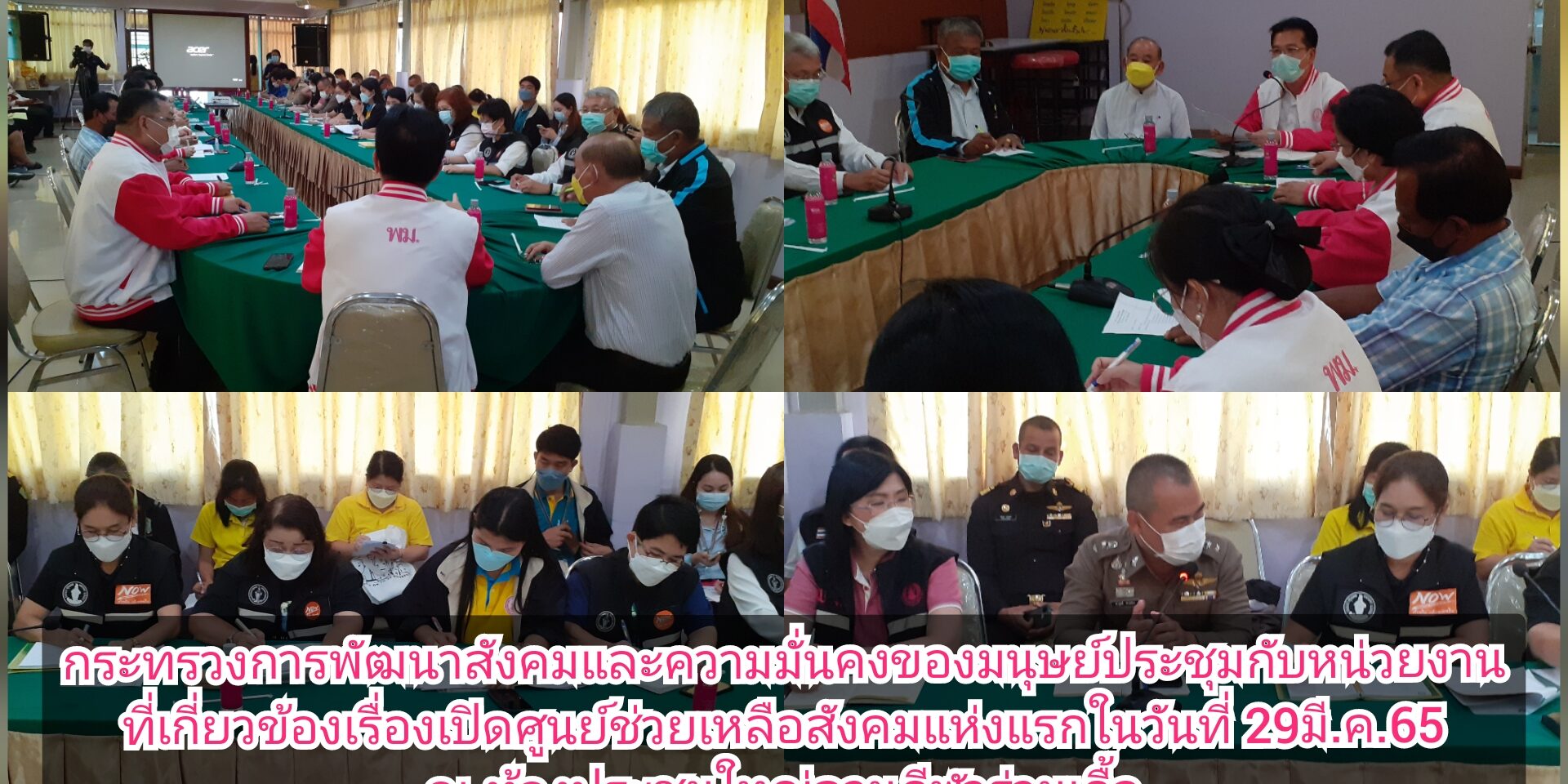 กระทรวงการพัฒนาสังคมและความมั่นคงของมนุษย์ ประชุมกับหน่วยงานที่เกี่ยวข้องเรื่องการเปิดศูนย์ช่วยเหลือสังคมแห่งแรกในวันที่29มี.ค.65 ณ.ห้องประชุมใหญ่ลานกีฬาหมู่บ้านร่วมเกื้อ