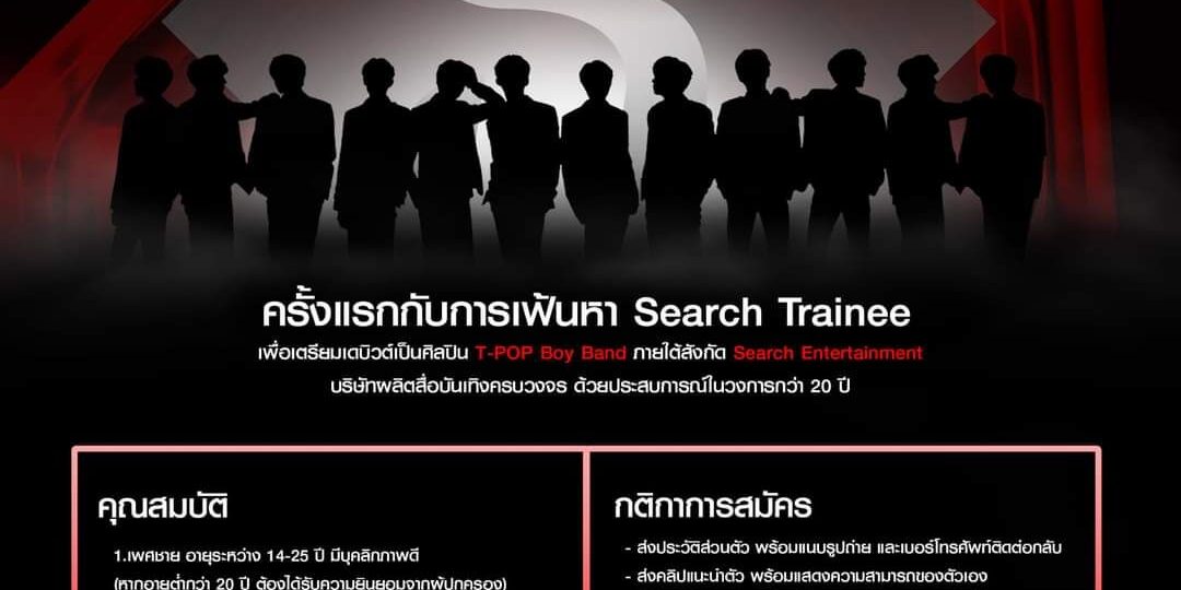 กลุ่มบริษัทเซิร์ช เอ็นเตอร์เทนเม้นท์ จำกัด ผุดโปรเจกต์ยักษ์แรกของปี 2022 กับการเปิดออดิชั่นเฟ้นหา Search Trainee เพศชาย เพื่อเดบิวต์เป็นศิลปิน T-POP Boy Band แรกของ Search Entertainment เพียงแค่ทุกคนมีความสามารถโดดเด่น น่าสนใจ มีความพยายาม ความอดทน และความมุ่งมั่นอยากที่จะเป็นศิลปิน อายุระหว่าง 14-25 ปี มีบุคลิกภาพดี (หากอายุต่ำกว่า 20 ปี ต้องได้รับความยินยอมจากผู้ปกครอง) มีความสามารถด้านการร้อง เต้น แร็ป และ ความสามารถพิเศษอื่นๆ และปัจจุบันจะต้องไม่มีพันธะสัญญากับค่ายเพลงใดทั้งสิ้น หากมีทักษะภาษาอังกฤษ หรือ ภาษาที่ 3 จะได้รับการพิจารณาเป็นพิเศษ
