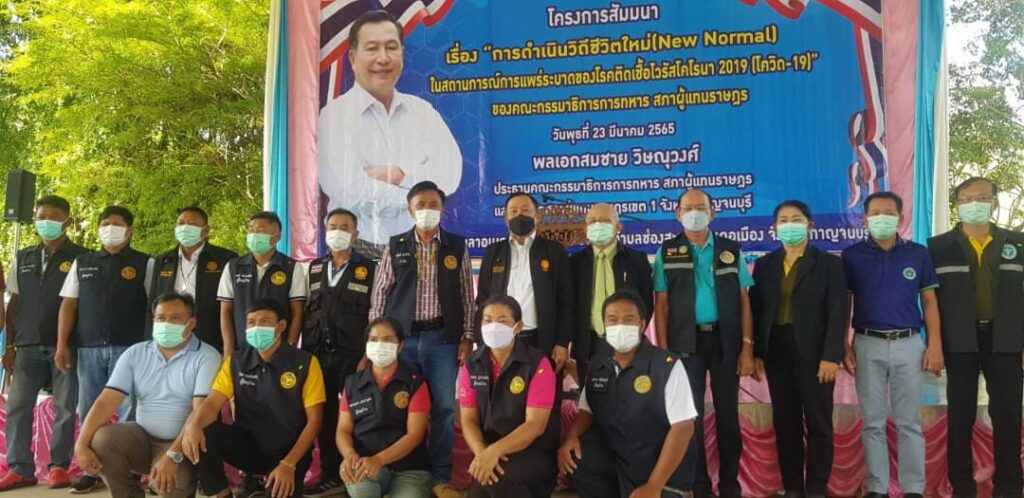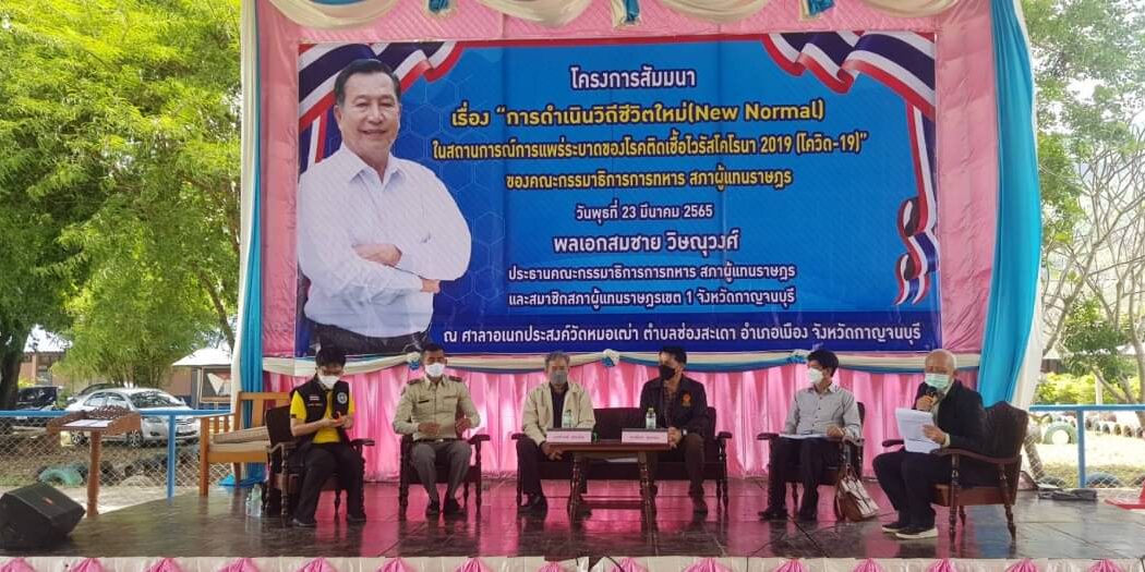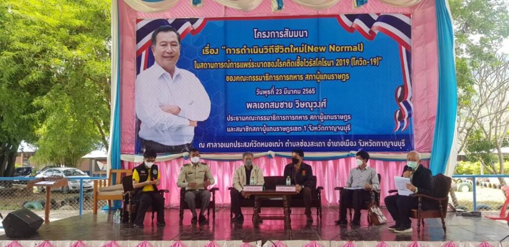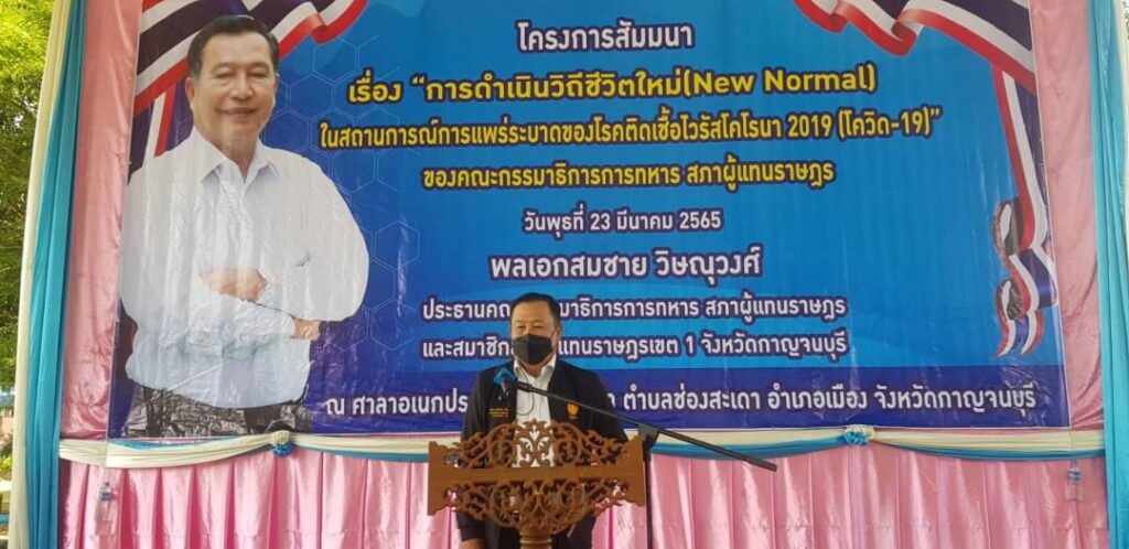วันที่(23 มีนาคม 2565)เวลา 09.30 น.พลเอกสมชาย วิษณุวงศ์ประธานคณะกรรมาธิการทหารสภาผู้แทนราษฎรและสมาชิกสภาผู้แทนราษฎรจังหวัดกาญจนบุรี เขต 1 ได้เดินทางมาเป็นประธานในพิธีเปิด(NewNormal)ในสถานการณ์การแพร่ระบาดของเชื้อไวรัสโควิด-19″ซึ่งจัดขึ้นโดยคณะกรรมาธิการทหารสภาผู้แทนราษฎร โดยมี นายธนณัฎฐ์ ศรีสันต์ นายอำเภอเมืองกาญจนบุรี,นายณัฐพัฒน์ พัดทอง ผู้บังคับบัญชากลุ่มงานคณะกรรมาธิการการทหาร สำนักกรรมาธิการ 2 สภาผู้แทนราษฎร,นางสาวสมหญิง ทัพหิกรณ์รักษาการตำแหน่งผู้เชี่ยวชาญเฉพาะด้านอนุรักษ์สัตว์ป่ากรมอุทยานแห่งชาติ สัตว์ป่า และพันธุ์พืช,นายไพฑูรย์ อินทรบุตร หัวหน้าเขตรักษาพันธุ์สัดว์ป่าสลักพระสำนักบริหารพื้นที่อนุรักษ์ที่ 3 (บ้านโป่ง),นายดำรงค์ อ่อนน้อม รองผู้อำนวยการแขวงทางหลวงชลบุรีที่ 1 (ฝ่ายปฏิบัติการ),นายดิเรก จอมทอง,นายสุวิชาณ สุวรรณาคะ,นายณรงค์ เกาะศิริ เจ้าพนักงานป่าไม้ชำนาญงาน ส่วนจัดการที่ดินและชุมชนในพื้นที่ป่าอนุรักษ์,นายวสันต์ สุนจิรัตน์ กำนันตำบลช่องสะเดา,นางสาวปภัสร์ลภัส แดงกูล นายก อบต.ช่องสะเดา,นางสาวคณัสนันท์ น้อยทิพย์ สารวัตรกำนันตำบลช่องสะเดา ผู้ใหญ่บ้าน,ผู้ช่วยผู้ใหญ่บ้าน,ผู้นำชุมชนตำบลช่องสะเดา,อสม.,แพทย์ประจำตำบลช่องสะเดา,สาธารณสุขจังหวัด ,หน่วยงานที่เกี่ยวข้อง แขกผู้มีเกียรติและสื่อมวลชนให้การต้อนรับ ณ ศาลาเอนกประสงค์วัดหมอเฒ่า ตำบลช่องสะเดา อำเภอเมือง จังหวัดกาญจนบุรี