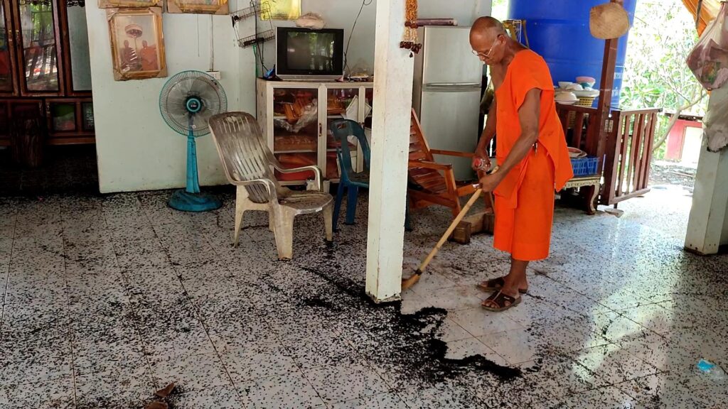 ด้าน พระครูปิยพัชรานุสิฐ เจ้าอาวาสวัดวังไทรทองวนาราม เล่าว่า แมลงปีกแข็งเหล่านี้ จะอยู่ในดิน พอฝนตกก็จะพากันขึ้นมา แล้วก็ไต่ไปตามห้องน้ำ ห้องนอน ห้องต่างๆภายในกุฏิ โดยเฉพาะเวลานอน ก็จะไต่เข้าไปในมุ้ง เราก็ต้องหนีไปนอนที่อื่น เพราะมีกลิ่นฉุน แสบตา โดยช่วงแรกนี้ ยังมาไม่เยอะเท่าที่ผ่านมา แต่ก็จะพากันมาทุกปี บางปีกวาดทิ้งทีละ 4-5ถุงปุ๋ย สร้างความเดือดร้อนแก่พระ และสิ่งของอย่างมาก จำเป็นต้องให้ญาติโยมมาช่วยจัดการ