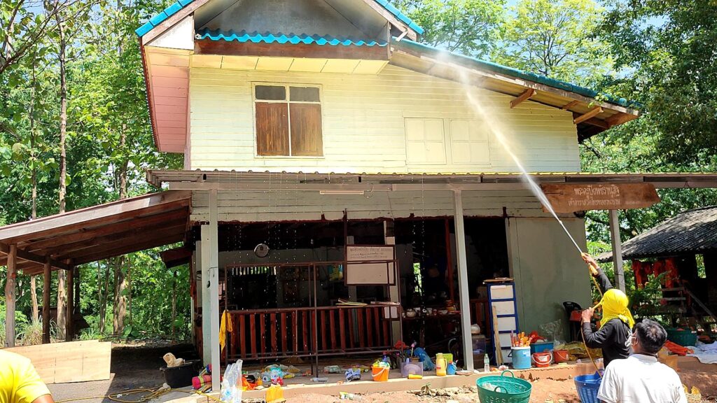 จากการสอบถามจากนายจำรัส แสงสุด 56 ปี เล่าว่า ตนได้ขับรถอีโก้งขึ้นมาในวัดเพื่อนำอุปกรณ์การพ่นยามากำจัดแมลงปีกแข็ง แล้วตนได้จอดรถไว้เพื่อต่อสายและอุปกรณ์พ่นยา แล้วเมื่อต่อเสร็จจนได้มาติดเครื่องพ่นยาและติดเครื่องยังไงก็ติด พยายามจะติดเครื่องอยู่เป็นเวลาเกือบครึ่งชั่วโมงเครื่องก็ยังไม่ติด ตนเลยคิดว่าไม่ได้บอกเจ้าที่เจ้าทาง ตนเลยบอกให้มัคทายกวัดให้ทำพิธีขอขมาขอให้เครื่องติดจะได้ทำการฉีดพ่นยาฆ่าแมลง หลังจากทำพิธีขอขมาเสร็จตนจึงได้ไปติดเครื่องอีโก้งติดหมุนเพียงครั้งเดียวเครื่องติดตนเลยตกใจน่าจะเจ้าที่แรง