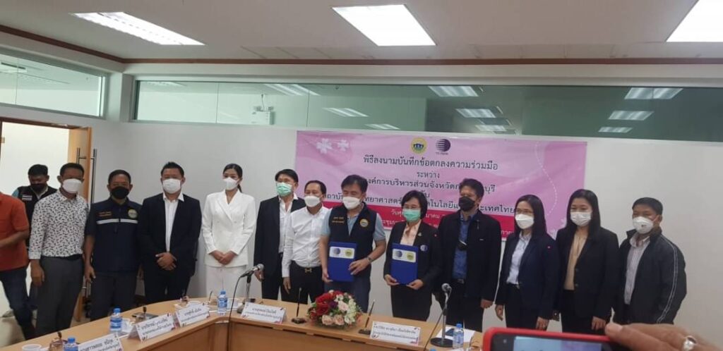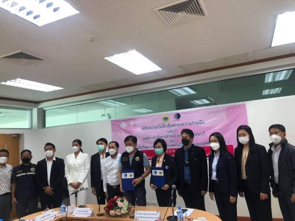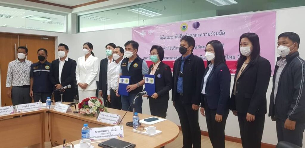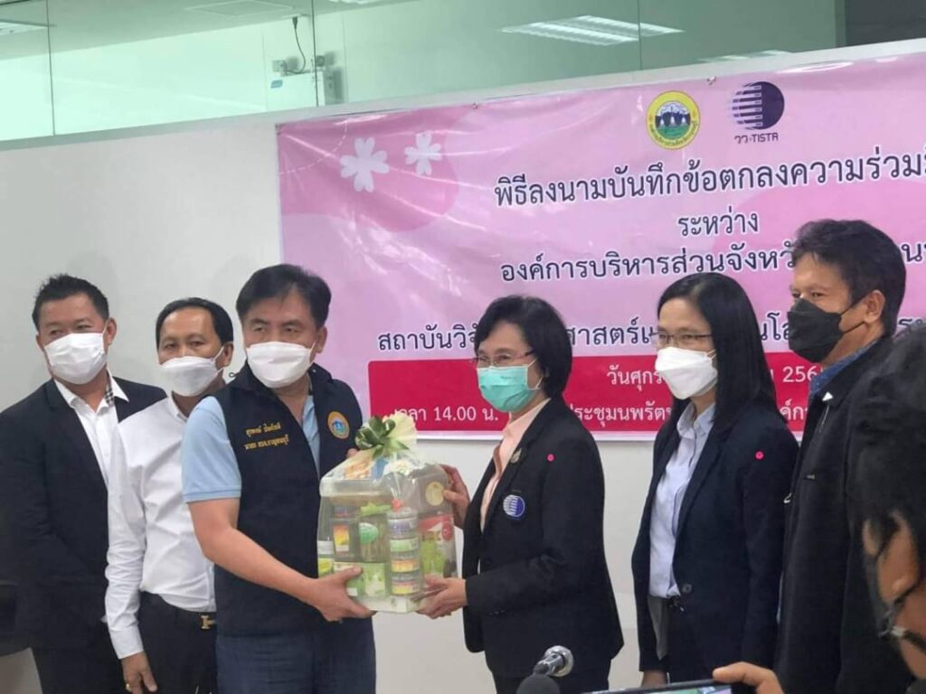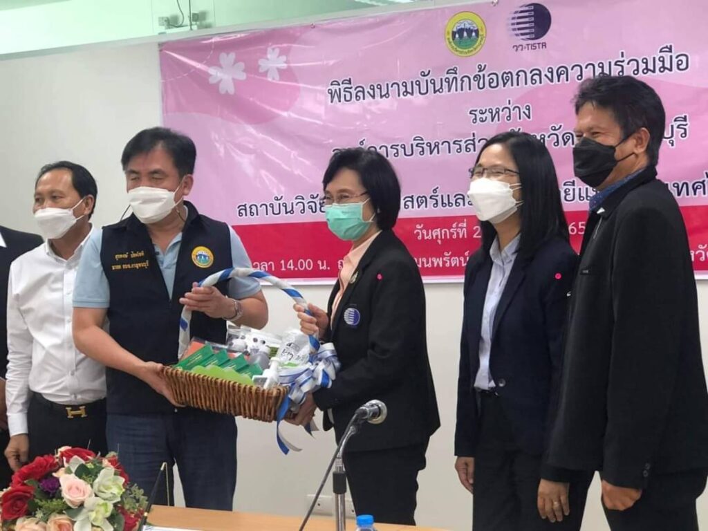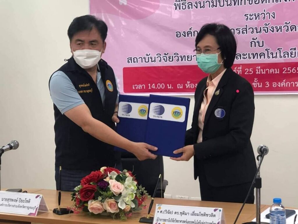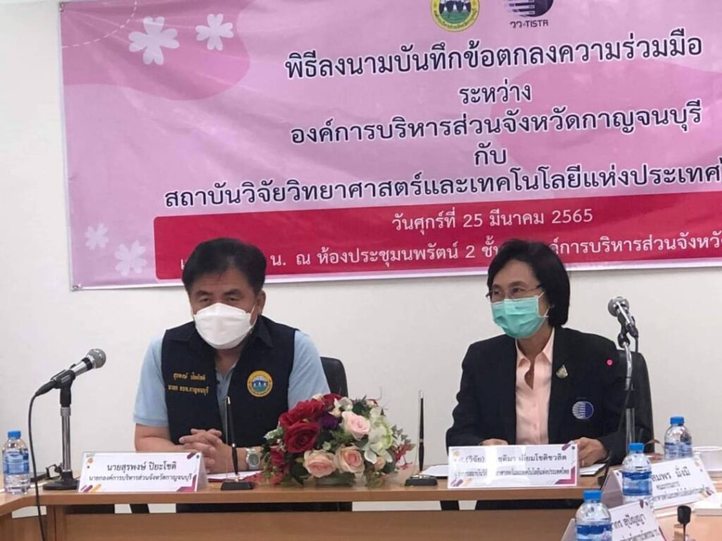 วันศุกร์ที่ ๒๕ มีนาคม ๒๕๖๕ เวลา ๑๔.๐๐ น.ณ ห้องประชุมในพรัตน์ ๒ องค์การบริหารส่วนจังหวัดกาญจนบุรี อ.เมือง จ.กาญจนบุรี นายสุรพรษ์ ปิยะโชติ นายกองค์การบริหารส่วนจังหวัดกาญจนบุรี พร้อมด้วย ศ.(วิจัย) ดร ชุติมา เอี่ยมโชติชวสิต ผู้ว่าการสถาบันวิจัยวิทยาศาสตร์และเทคโนโลยีแห่งประเทศไทย ร่วมพิธีลงนามบันทึกข้อตกลงว่าด้วยการส่งสริมการนำผลงานการวิจัย และพัฒนาทางด้านวิทยาศาสตร์เทคโนโลยีและนวัตกรรม มาใช้ประโยชน์และสร้างมูลค่าเพิ่มในการบริหารจัดการสินค้าเกษตรอย่างยั่งยืน ทั้งนี้การทำบันทึกข้อตกลงดังกล่าวมีวัตถุประสงค์ เพื่อส่งเสริมความเข้มแข็งในการบริหารจัดการสินค้าการเกษตรอย่างยังยืนมุ่งเน้นการผลิต/การแปรรูปให้ได้มาตรฐาน สามารถสร้างแบรนด์สินค้า และสร้างมูลค่าให้กับสินค้าเกษตรได้อย่างมีประสิทธิภาพ และเป็นการสร้างโอกาสให้กับเกษตรกร ส่งเสริมอาชีพในชุมชน แก้ไขปัญหาผลผลิตด้านการเกษตรให้กับเกษตรกรได้มีทางเลือกในการจัดการผลผลิต
