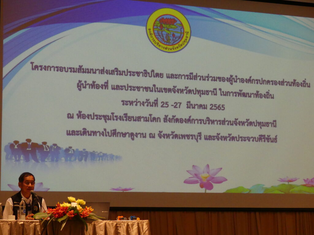 วันที่ 27 มีนาคม 2565 พล.ต.ท คำรณวิทย์ ธูปกระจ่าง นายกองค์การบริหารส่วนจังหวัดปทุมธานี เปิดเผยว่าที่ห้องสัมมนาเพชรบุรี โรงแรมรีเจ้นท์ ชะอำ บีชรีสอร์ท จ.เพชรบุรี ได้จัดสัมมนา ส.อบจ. นายกท้องถิ่นทั้งจังหวดปทุมธานีร่วม200คนในโครงการอบรมสัมมนาส่งเสริมประชาธิปไตย และการมีส่วนร่วมของผู้นำองค์กรปกครองส่วนท้องถิ่น ผู้นำท้องที่ และประชาชนในเขตจังหวัดปทุมธานี ในการพัฒนาท้องถิ่น จำนวน องค์กรปกครองส่วนท้องถิ่น 65 แห่ง ประกอบด้วยองค์การบริหารส่วนจังหวัด 1 แห่ง เทศบาล 29 แห่ง องค์การบริหารส่วนตำบล 35 แห่ง 250 คน โดยมีนายเสริมศักดิ์ พงษ์พานิช อดีตปลัดกระทรวงมหาดไทย ดร.สุริยะ หินเมืองเก่า ผู้อำนวยการกลุ่มงานแผนพัฒนาท้องถิ่นกองพัฒนาและส่งเสริมการบริหารงานท้องถิ่น กรมส่งเสริมการปกครองส่วนท้องถิ่น กระทรวงมหาดไทย ให้เกียรติเป็นวิทยากร เพื่อความเป็นน้ำหนึ่งใจเดียวกันในการพัฒนาจังหวัดปทุมธานีให้1ใน5ของประเทศสำหรับเมืองน่าอยู่