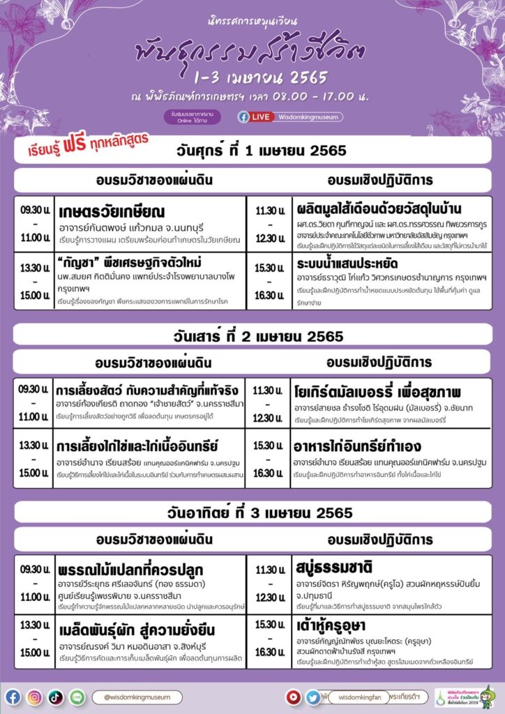 สอบถามรายละเอียดเพิ่มเติมได้ที่ โทรศัพท์ 02-529-2212-13, 087-359-7171 คลิกดูรายละเอียดได้ที่ www.wisdomking.or.th หรือ facebook / Instagram /Line ID : @wisdomkingmuseum และ Youtube พิพิธภัณฑ์การเกษตรเฉลิมพระเกียรติฯ