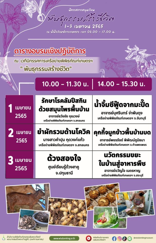 วันที่ 28 มีนาคม 2565 พิพิธภัณฑ์การเกษตรเฉลิมพระเกียรติพระบาทสมเด็จพระเจ้าอยู่หัว เตรียมจัดงานนิทรรศการหมุนเวียน “พันธุกรรมสร้างชีวิต” ระหว่างวันที่ 1 – 3 เมษายน 2565 ตั้งแต่เวลา 08.00 – 17.00 น. เรียนรู้พระราชกรณียกิจ และสืบสานพระราชปณิธานสมเด็จพระกนิษฐาธิราชเจ้า กรมสมเด็จพระเทพรัตนราชสุดาฯ สยามบรมราชกุมารี ด้านการอนุรักษ์พันธุกรรม พร้อมด้วยหลักสูตรการอบรมวิชาของแผ่นดินและอบรมเชิงปฏิบัติการ อิ่ม อร่อย ชม ช้อป สินค้าเกษตรอินทรีย์จากร้านค้าเครือข่ายและภาคีความร่วมมือจากทั่วประเทศ ภายใต้มาตรการป้องกันการแพร่ระบาดของเชื้อไวรัสโคโรนา 2019 อย่างเคร่งครัด ในรูปแบบ Onsite ณ พิพิธภัณฑ์การเกษตรเฉลิมพระเกียรติฯ จังหวัดปทุมธานี และทาง Online ผ่านทาง Facebook พิพิธภัณฑ์การเกษตรเฉลิมพระเกียรติฯ