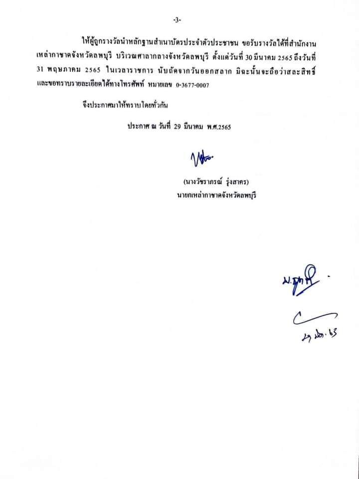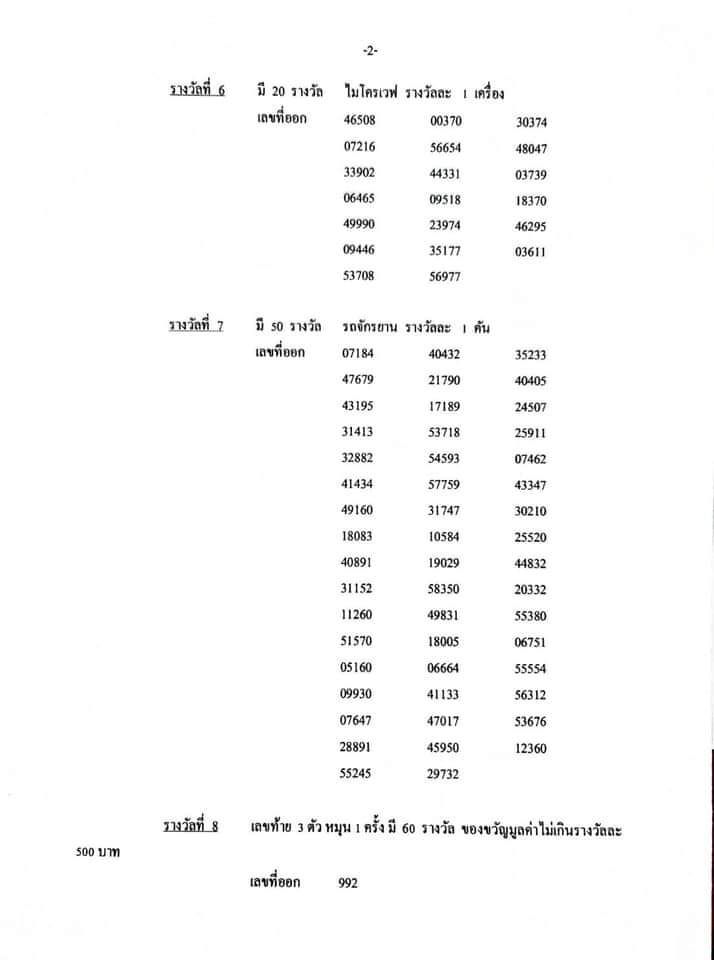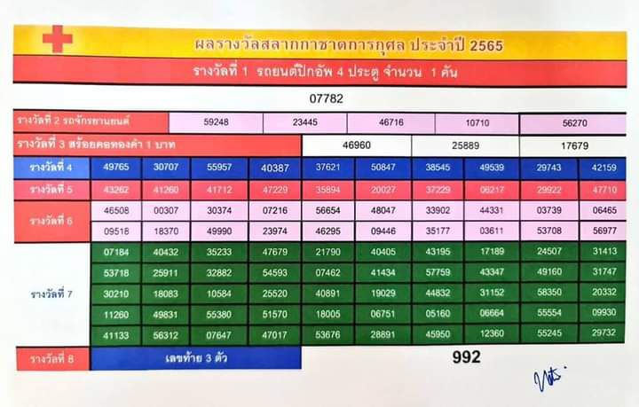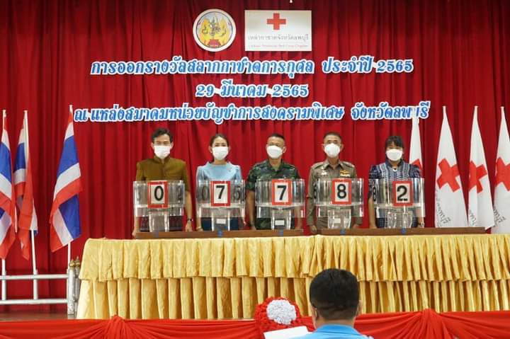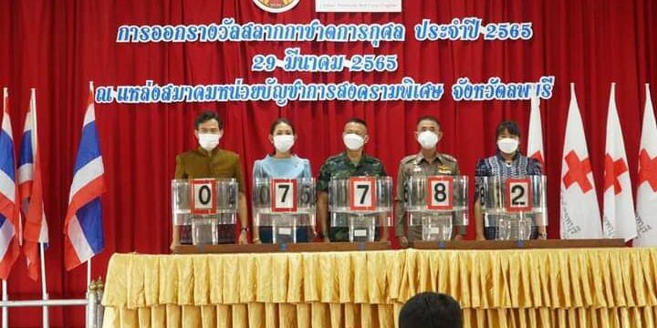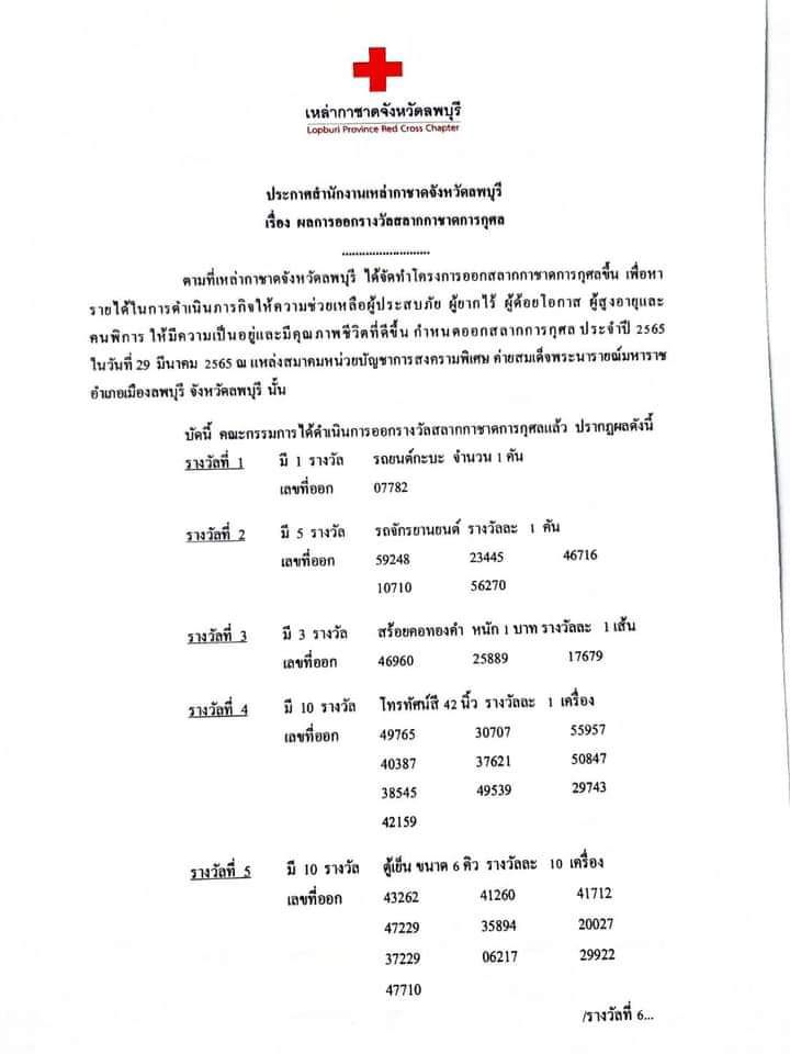 โดยรางวัลที่ 1 มี 1 รางวัล หมายเลขที่ออกได้แก่ 07782 จะได้รับรางวัลเป็นรถยนต์กระบะ จำนวน 1 คัน และรางวัลที่ 2 มี 5 รางวัล เป็นรถจักรยานยนต์ รางวัลละ 1 คัน หมายเลขที่ออก ได้แก่ 59248 , 23445 , 46716 , 10710 และ 56270 สำหรับรางวัลที่ 8 เลขท้าย 3 ตัว หมุน 1 ครั้ง มูลค่าไม่เกิน 500 บาท จำนวน 60 รางวัล เลขที่ ออก 992 สามารถตรวจรางวัลอื่นๆ ได้ทางเว็บไซต์จังหวัดลพบุรี www.lopburi.go.th รายได้จากการจำหน่ายสลากกาชาดการกุศล เหล่ากาชาดจังหวัดลพบุรี จักได้นำไปช่วยเหลือพี่น้องประชาชนชาวจังหวัดลพบุรีที่ได้รับความเดือดร้อนและรอความช่วยเหลือในทุกๆด้าน ให้เกิดประโยชน์สูงสุดต่อไป