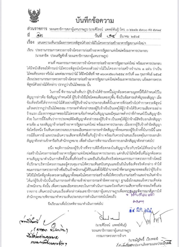 ตามหนังสือของกรรมการตรวจการจ้างฯที่ส่งถึงนายสาธิต ประเสริฐศักดิ์ ประธานคณะกรรมการตรวจการจ้างฯลงวันที่ 14 มี.ค.65 อันเป็นเหตุที่ ผู้ว่าจ้างสามารถบอกเลิกสัญญากับผู้รับจ้างได้ และนางพรพิศ เพชรเจริญ เลขาธิการสภาผู้แทนราษฎร ได้รับทราบแล้วและสั่งข้าราชการห้ามไม่ให้หนังสือฉบับนี้หลุดรอดถึงนายวิลาศ จันทร์พิทักษ์ อดีตประธานกมธ.ป.ป.ช.สภาผู้แทนราษฎรอย่างเด็ดขาด