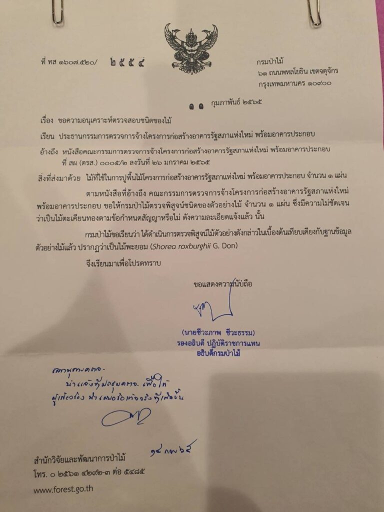(1 เม.ย.65)ที่อาคารรัฐสภา เมื่อเวลา 9.00 น. นายวัชระ เพชรทอง อดีตส.ส.ประชาธิปัตย์ ยื่นหนังสือผ่านงานสารบรรณถึงนายชวน หลีกภัย ประธานสภาผู้แทนราษฎร ขอให้พิจารณาดำเนินการตามกฎหมาย กรณีมีการกระทำที่ส่อถึงการกระทำความผิดทางอาญา แพ่ง วินัย และละเมิด ในการไม่ปฏิบัติตามสัญญาการก่อสร้างอาคารรัฐสภาแห่งใหม่ฯ เกี่ยวกับไม้ในการก่อสร้างและตกแต่งอาคารรัฐสภาแห่งใหม่ ด้วยขณะนี้ได้ปรากฏข้อเท็จจริงถึงผลการตรวจพิสูจน์ตัวอย่างไม้ในโครงการดังกล่าว ซึ่งข้อกำหนดในสัญญา ก่อสร้างระบุให้ผู้รับจ้างใช้ “ไม้ชนิดตะเคียนทอง” ปูพื้น แต่ปรากฏผลการพิสูจน์จากกรมป่าไม้ ลงวันที่ 11 ก.พ.65 แจ้งผลการตรวจพิสูจน์ตัวอย่างไม้ ผลปรากฏว่าเป็น “ไม้พะยอม” มิใช่ “ไม้ตะเคียนทอง” ตามข้อกำหนดในสัญญาก่อสร้างฯ ซึ่งการใช้ “ไม้พะยอม” มาปูพื้นแทน “ไม้ตะเคียนทอง” เป็นเหตุให้สำนักงานเลขาธิการสภาผู้แทนราษฎร (ผู้ว่าจ้าง) ซึ่งเป็นส่วนราชการได้รับความเสียหายอย่างร้ายแรง เนื่องจากคุณภาพของไม้ไม่ตรงตามข้อกำหนดในสัญญาก่อสร้างฯ และมีคุณภาพต่ำกว่าที่กำหนด ประกอบกับได้มีการจ่ายเงินซึ่งได้มาจากงบประมาณแผ่นดินอันมาจากภาษีอากรของประชาชนทั้งประเทศให้แก่ผู้รับจ้างไปแล้วกว่า 90,000 ล้านบาท จากจำนวนเงินตามสัญญาจ้างทั้งสิ้น 12,280 ล้านบาทนั้น