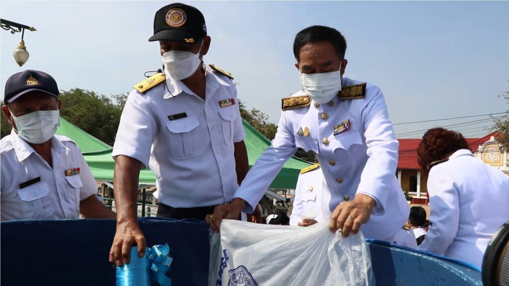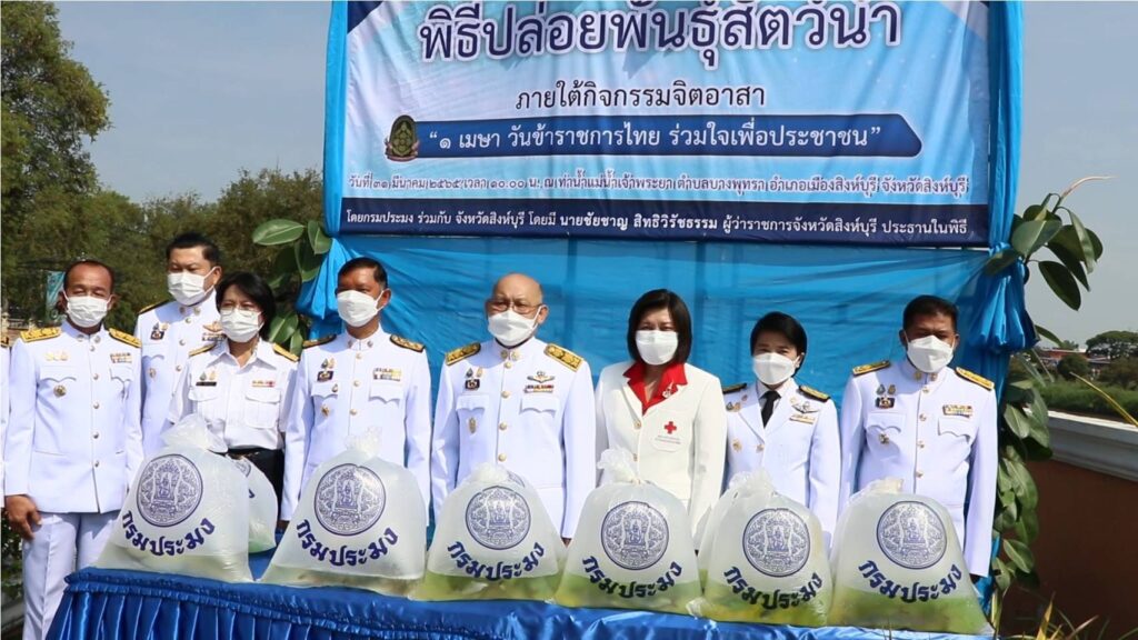 ต่อจากนั้นผู้ว่าราชการจังหวัดสิงห์บุรีพร้อมนายกเหล่ากาชาด รองผู้ว่าราชการจังหวัดสิงห์บุรี หัวหน้าส่วนราชการ และข้าราชการพลเรือน ร่วมปล่อยพันธุ์สัตว์น้ำ กิจกรรมจิตอาสา 1 เมษา วันข้าราชการไทย ณ บริเวณท่าน้ำแม่น้ำเจ้าพระยา ศาลากลางจังหวัดสิงห์บุรีหลังเดิม โดยมี นางสาวอุมาภรณ์ จรดล ผู้อำนวยการศูนย์วิจัยและพัฒนาการเพาะเลี้ยงสัตว์น้ำจืดสิงห์บุรี ร่วมกับสำนักงานประมงจังหวัดสิงห์บุรี ข้าราชการกรมประมง กระทรวงเกษตรและสหกรณ์ จัดกิจกรรมปล่อยพันธุ์สัตว์น้ำ จำนวน 50,010 ตัว ลงสู่แม่น้ำเจ้าพระยาจำนวน 3 ชนิด ได้แก่ 1.ปลาตะเพียนทอง จำนวน 30,000 ตัว 2.ปลาตะเพียนขาว จำนวน 20,000 ตัว และ 3.ปลาสวาย จำนวน 10 ตัว เพื่อเป็นการอนุรักษ์ทรัพยากรสัตว์น้ำของไทยดำรงอยู่ และส่งเสริมให้ข้าราชการตระหนักถึงเกียรติหน้าที่ สามัคคี ซื่อสัตย์ ในการปฏิบัติหน้าที่ พร้อมทั้งเป็นผู้เสียสละและอุทิศเวลาเพื่อประโยชน์ต่อส่วนรวม