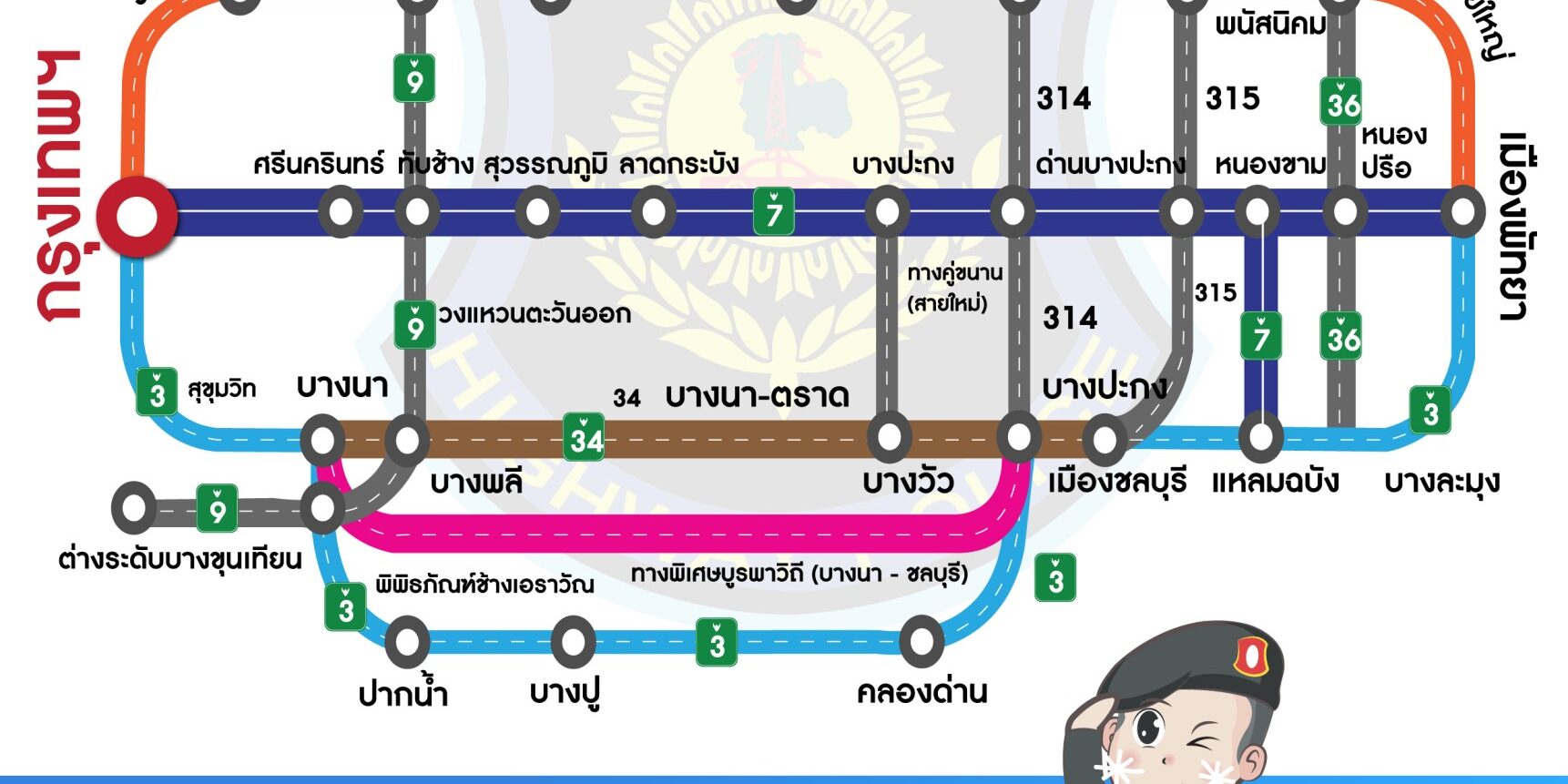 3.ใช้ทางหลวงหมายเลข 34 (บางนา- ตราด) ผ่านบางนา-บางปะกง หรือใช้ทางพิเศษบูรพาวิถี ออกสู่ภาคตะวันออก