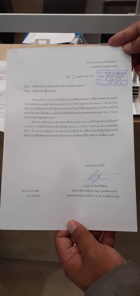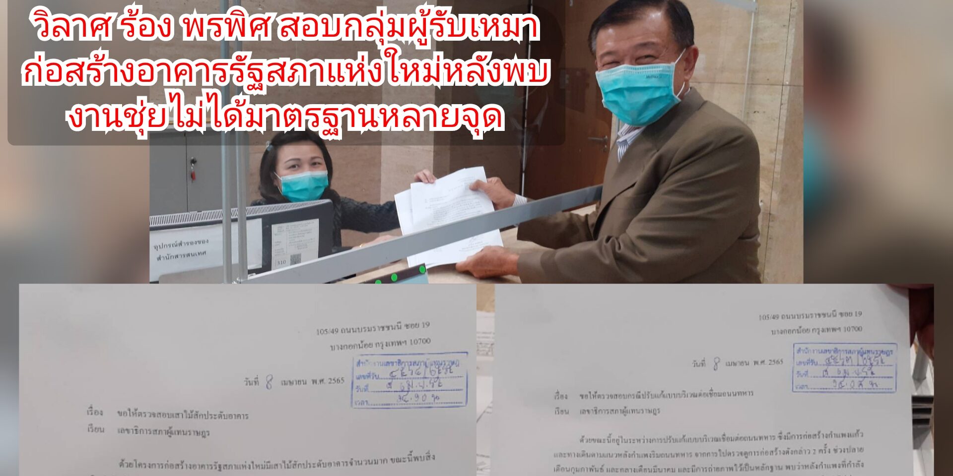 วันนี้ (8 เม.ย.65) ที่อาคารรัฐสภา เมื่อเวลา 14.04 น.นายวิลาศ จันทร์พิทักษ์ อดีตส.ส.พรรคประชาธิปัตย์ ยื่นหนังสือผ่านงานสารบรรณถึงนางพรพิศ เพชรเจริญ เลขาธิการสภาผู้แทนราษฎร ให้ตรวจสอบกรณีปรับแก้แบบบริเวณต่อเชื่อมถนนทหาร ซึ่งมีการก่อสร้างกำแพงแก้วและทางเดินตามแนวหลังกำแพงริมถนนทหาร จากการไปตรวจดูการก่อสร้างดังกล่าว 2 ครั้ง ช่วงปลายเดือนกุมภาพันธ์ และกลางเดือนมีนาคม และมีการถ่ายภาพไว้เป็นหลักฐาน พบว่าหลังกำแพงที่กำลังก่อสร้างเป็นโพรง พื้นไม่มีการบดอัด อีกทั้งดินที่ใช้ถมมีเศษหินและเศษขยะจำนวนมาก จึงเห็นว่าไม่น่าจะเป็นการก่อสร้างที่ถูกต้องตามแบบ จึงขอให้ตรวจสอบดำเนินการแก้ไขให้ถูกต้อง รวมทั้งให้ตรวจสอบการปฏิบัติหน้าที่ของกลุ่มบริษัทผู้ควบคุมงาน ATTA ด้วยว่าทำงานตามอำนาจหน้าที่จริงหรือไม่ มีการรายงานให้คณะกรรมการตรวจการจ้างหรือไม่ มีการเอื้อประโยชน์ให้ผู้หนึ่งผู้ใดหรือไม่ เพื่อร้องเรียนผู้รับผิดชอบตามกฎหมายต่อไป นอกจากนี้นายวิลาศยังยื่นหนังสืออีก 1 ฉบับขอให้นางพรพิศตรวจสอบเสาไม้สักประดับอาคารจำนวนมากที่ขณะนี้พบสิ่งผิดปกติอยู่ 2 ประการคือ