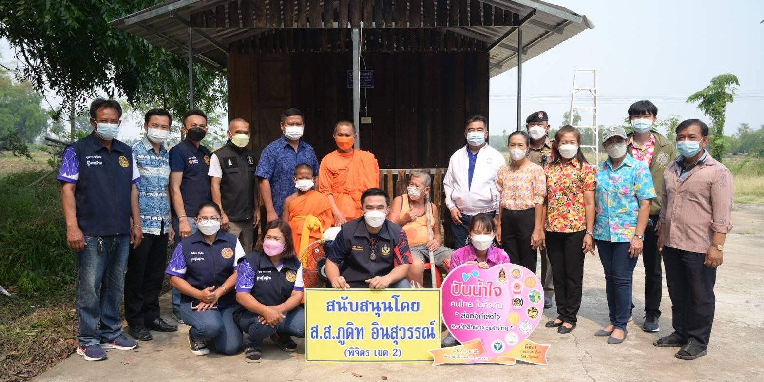 พระครูสิริสุตโสภณ,ดร. เจ้าคณะอำเภอดงเจริญ วัดสำนักขุนเณร ต.สำนักขุนเณร อ.ดงเจริญ จ.พิจิตร พร้อมด้วยนายภูดิท อินสุวรรณ์ สมาชิกสภาผู้แทนราษฎรพิจิตร เขต 2 นายสิทธิพันธ์ บุตรศรี นายอำเภอดงเจริญ พ.ต.อ.นิเวศน์ เพชรดี ผกก.สภ.ดงเจริญ กำนันมงคล พุกเปี่ยม นางสาวสุริสา นิลนารถ ตัวแทนสำนักงานวัฒนธรรมจังหวัดพิจิตร นายกฤติธี พาอินทร์ เจ้าหน้าที่พลศึกษาอำเภอ ผู้ใหญ่บุญธรรม วิชาโคตร พร้อมด้วยผู้นำท้องที่ผู้นำท้องถิ่น ร่วมส่งมอบบ้านให้กับนายณัฎฐ์วัฒน์ พรมสอน หมู่ ๔ บ้านกุดระกำ ต.สำนักขุนเณร อ.ดงเจริญ จ.พิจิตร