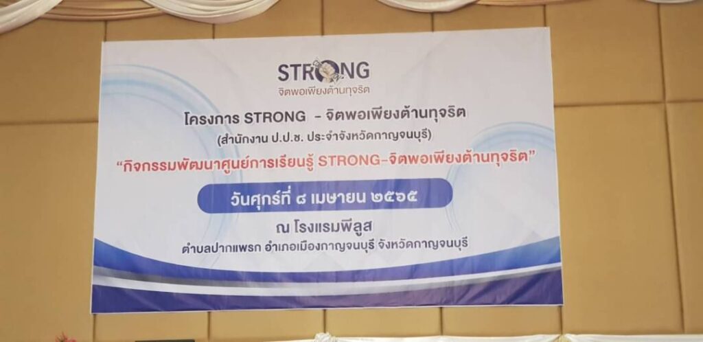 8เมษายน2565เวลา10.00น.ณ.โรงแรมพีลุส นายอิศญพงศ์ เข็มทอง ประธานชมรม STRONG-จิตพอเพียงต้านทุจริตจังหวัดกาญจนบุรี เป็นประธานเปิดงาน และการบรรยายให้ความรู้โดยโค้ชชมรม STRONGฯ ในหัวข้อ “ความเป็นมาของโครงการ STRONG – จิตพอเพียงต้านทุจริต” “โมเดล STRONG – จิตพอเพียงต้านทุจริต” และ”ผลกระทบของการทุจริต ” “การเสริมสร้างองค์ความรู้เฝ้าระวังการทุจริต” และ “การขัดกันแห่ง