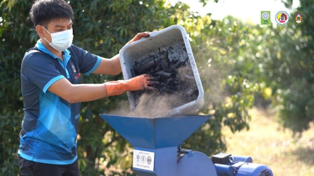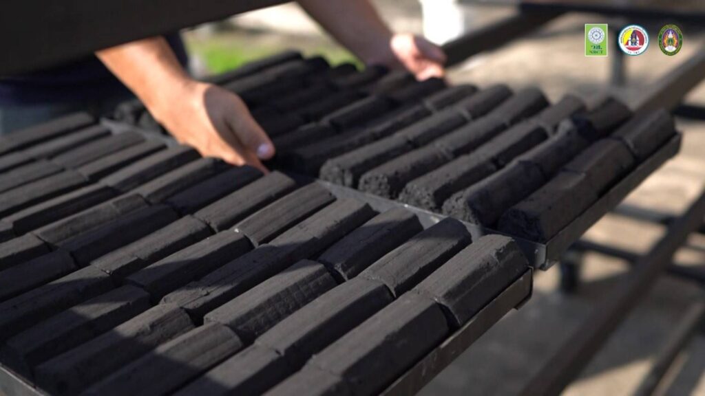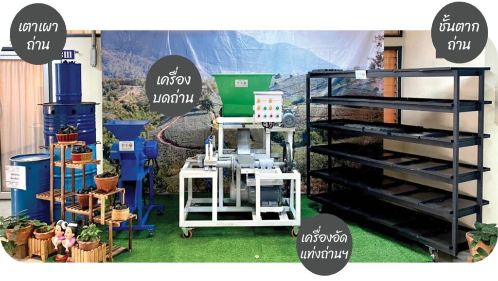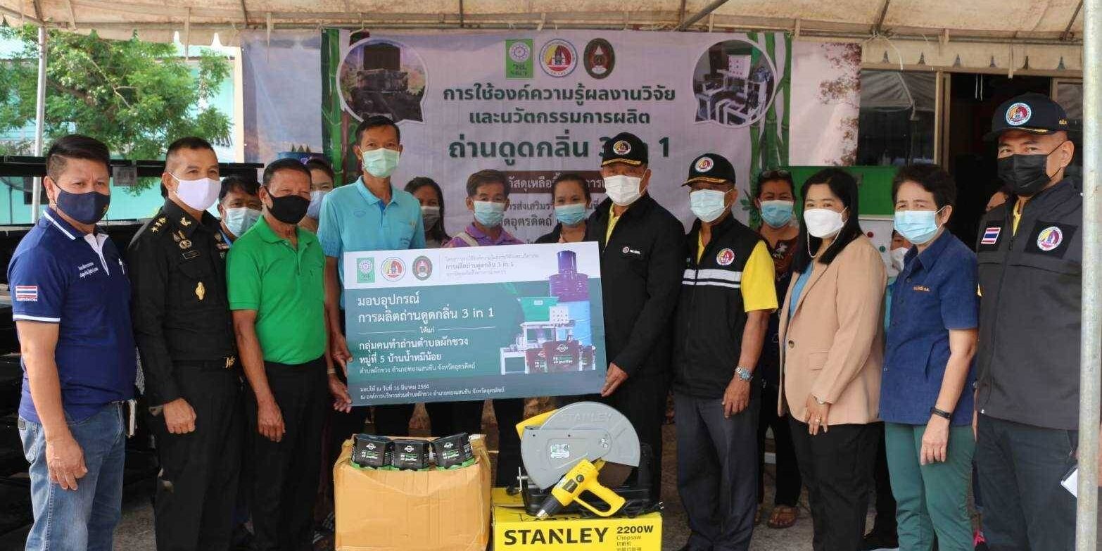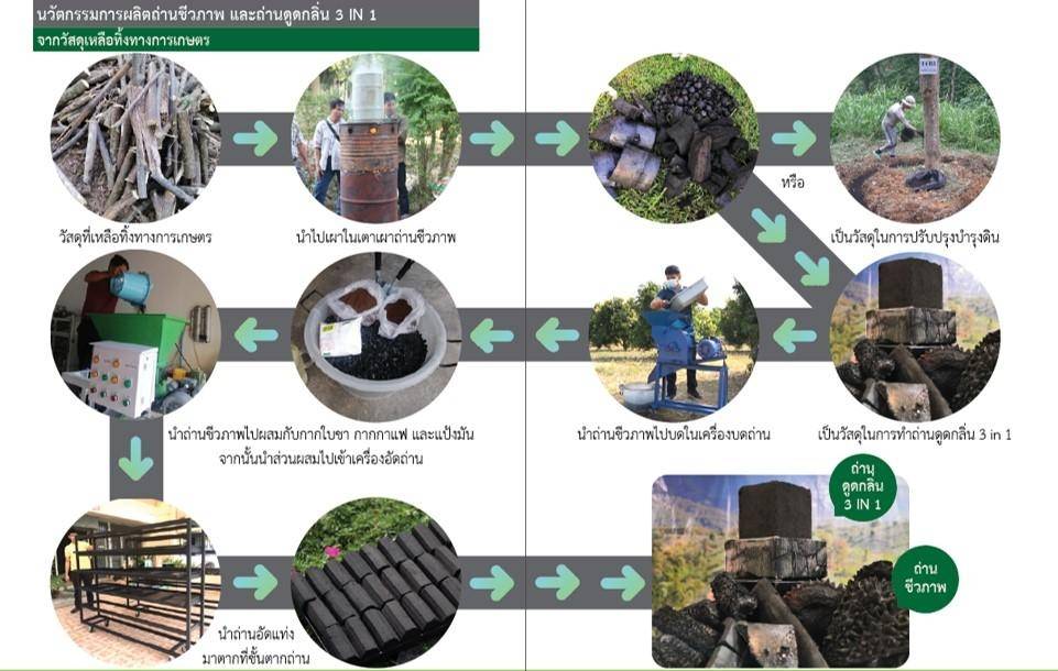 จากปัญหาเศษวัสดุเหลือทิ้งทางการเกษตร อาทิ เปลือกทุเรียน เหง้ามันสำปะหลัง แกนข้าวโพด ข้อไม้ไผ่ รวมถึงเศษกิ่งไม้ริมทาง ยังไม่ได้ถูกนำมาใช้ให้เกิดประโยชน์มากนัก อีกทั้งการจัดการโดยเผาเศษวัสดุเหลือทิ้งในที่โล่ง ยังเป็นการปล่อยก๊าซเรือนกระจกและมวลสารเข้าสู่ชั้นบรรยากาศ องค์ความรู้และนวัตกรรมการผลิตถ่านดูดกลิ่น 3 In 1 ด้วยวิธีไพโรไลซิส จึงนับเป็นแนวทางหนึ่งในการแก้ไขประเด็นปัญหาดังกล่าวได้ ขณะนี้นักวิจัยได้ถ่ายทอดองค์ความรู้และติดตั้งนวัตกรรมแล้ว ประกอบด้วย เตาผลิตถ่านดูดกลิ่นแบบไพโรไลซิส เครื่องบดถ่าน ชั้นตากถ่าน เครื่องอัดถ่าน เครื่องเจียรตัดแต่งถ่าน และเครื่องเป่าลมร้อน พร้อมการออกแบบ เพื่อส่งเสริมให้เกิดผลิตภัณฑ์และเกษตรกรต้นแบบ กว่า 100 ราย ใน 2 จังหวัดเป้าหมาย คือ กลุ่มคนทำถ่าน จ.อุตรดิตถ์ และกลุ่มคนเอาถ่าน จ.สุรินทร์ โดยได้รับการสนับสนุนทุนวิจัยจากสำนักงานการวิจัยแห่งชาติ (วช.) บูรณาการการทำงานร่วมกับกองอำนวยการรักษาความมั่นคงภายในราชอาณาจักร (กอ.รมน.)