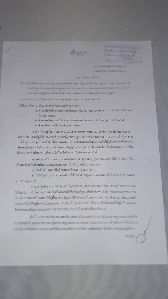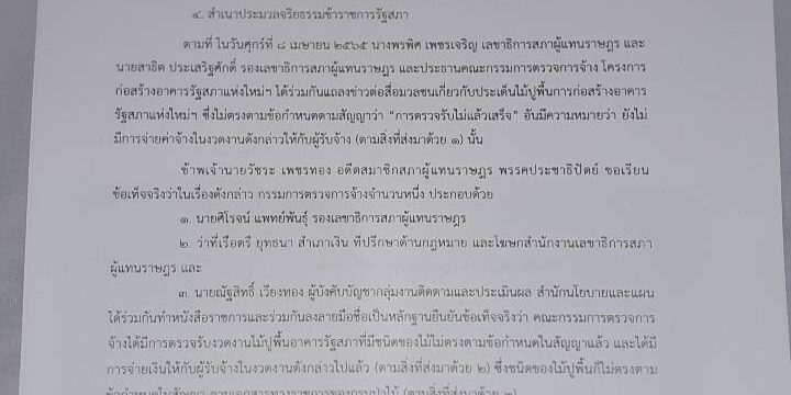 (11ม.ย.65)ที่อาคารรัฐสภา เมื่อเวลา10.25 น.นายวัชระ เพชรทอง อดีตส.ส.พรรคประชาธิปัตย์ ยื่นหนังสือผ่านงานสารบรรณถึงนายชวน หลีกภัย ประธานสภาผู้แทนราษฎร ให้ตั้งคณะกรรมการสอบสวนนางพรพิศ เพชรเจริญ เลขาธิการสภาผู้แทนราษฎร และนายสาธิต ประเสริฐศักดิ์ รองเลขาธิการสภาผู้แทนราษฎรและประธานคณะกรรมการตรวจการจ้าง โครงการก่อสร้างอาคารรัฐสภาแห่งใหม่ ซึ่งได้กระทำความผิดประมวลจริยธรรมข้าราชการรัฐสภา