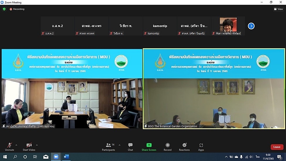 สถาบันวิจัยและพัฒนาพื้นที่สูง (องค์การมหาชน) หรือ สวพส. ร่วมกับ องค์การสวนพฤกษศาสตร์ หรือ อสพ. จัดพิธีลงนามบันทึกข้อตกลงความร่วมมือทางวิชาการ (MOU) ในรูปแบบเสมือนจริง (Virtual MOU Signing Ceremony) ผ่านสื่ออิเล็กทรอนิกส์ โดยมีวัตถุประสงค์เพื่อสนับสนุน ส่งเสริม และร่วมมือทางวิชาการด้านพฤกษศาสตร์ ป่าไม้ ทรัพยากรธรรมชาติและความหลากหลายทางชีวภาพ ภูมิปัญญาท้องถิ่น และประเด็นอื่นๆ ที่เกี่ยวข้อง เพื่อต่อยอดการอนุรักษ์ การวิจัย และการนำทรัพยากรพันธุ์พืชมาใช้ประโยชน์ทั้งในเชิงสังคมและเชิงพาณิชย์อย่างยั่งยืน ตลอดจนแลกเปลี่ยนข้อมูล ความรู้ ถ่ายทอดเทคโนโลยี และพัฒนาบุคลากร เพื่อการวิจัย การอนุรักษ์ รวมทั้งพัฒนาแหล่งเรียนรู้ด้านการเกษตรและความหลากหลายทางชีวภาพ ตลอดจนสร้างความตระหนัก ให้สาธารณชนเห็นถึงคุณค่าความสำคัญของพันธุ์พืช ทรัพยากรธรรมชาติและสิ่งแวดล้อมต่อไป