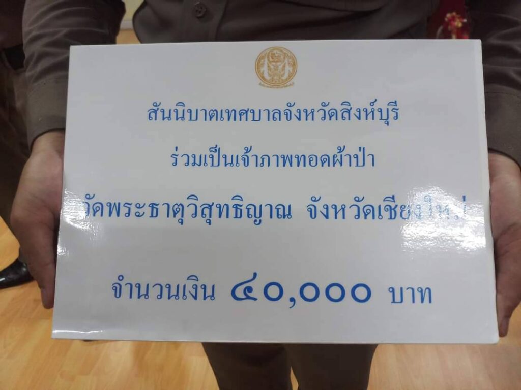 นำโดย นายประเสริฐ ธรรมศิริกาชัย ประธานฯ พร้อมคณะทีมงานเทศบาลในจังหวัดสิงห์บุรี ที่ร่วมเป็นเจ้าภาพทอดผ้าป่าฯ ในวันที่ 24 เมษายน 2565 ณ วัดพระธาตุวิสุทธิญาณ (วัดป่าไตรลักษณาราม) ต.ลวงเหนือ อ.ดอยสะเก็ด จังหวัดเชียงใหม่ จำนวนเงิน 40,000 บาท