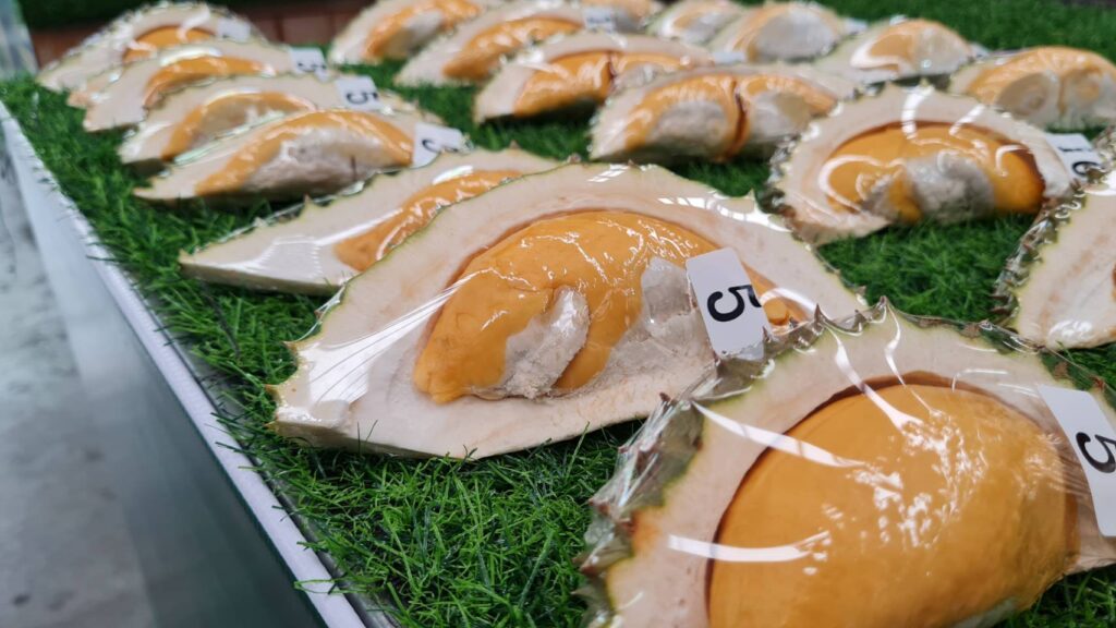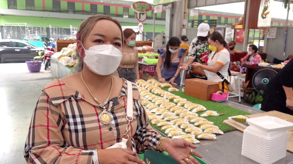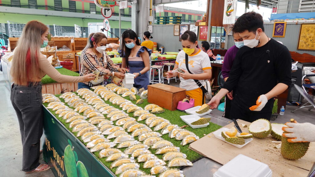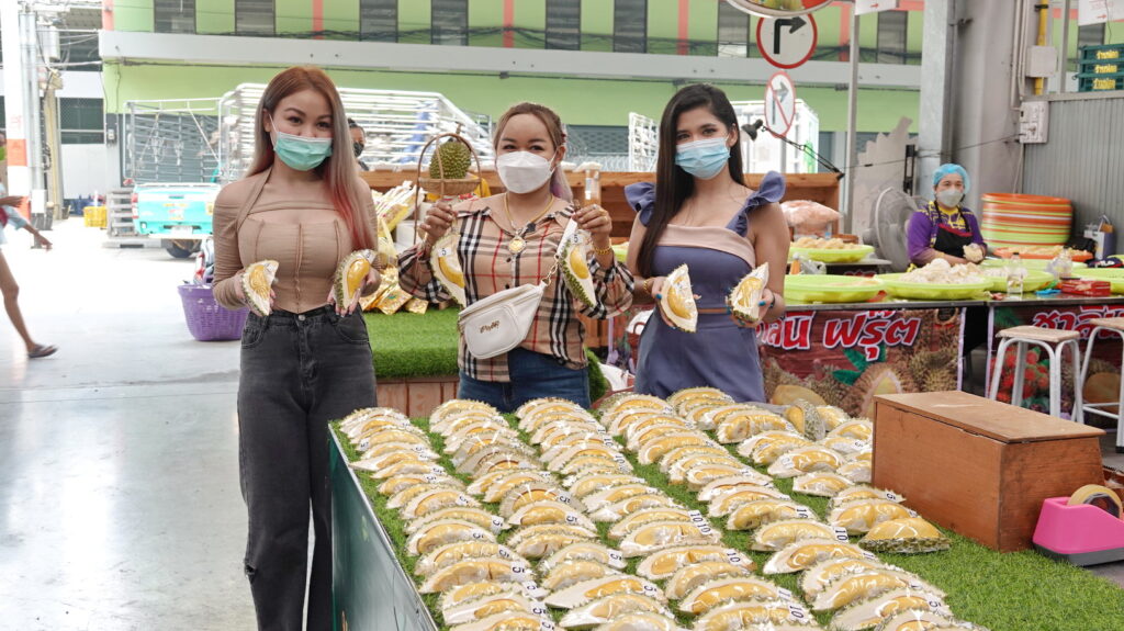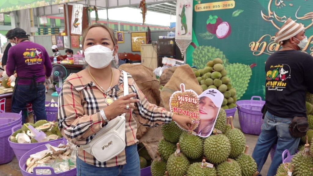 นางสาวชาลินี ลอยนุ้ย อายุ 41 ปี เจ้าของร้านทุเรียน ชาลินีฟรุ๊ต ตลาดสี่มุมเมือง กล่าวว่า เนื่องจากตนเองเห็นคนที่มีเงินน้อยเขาได้มาเก็บเปลือกทุเรียนแกะเศษเนื้อทุเรียนกิน เราจึงอยากจะให้คนที่รายได้น้อย ได้กินของถูกของดี เราจึงได้จัดโปรโมชั่นนี้ขึ้นมารับช่วงสงกรานต์ โดยขายทุเรียนตั้งแต่ 5 บาท 10 บาท 20 บาท ตามขนาดพูทุเรียน เป็นพันธุ์ทุเรียนพวงมณี ทุเรียนพันธุ์นกกระจิบ ทุเรียนพันธุ์หมอนทอง ทุเรียนพันธุ์ชะนี ซึ่งเป็น 1000 ที่ส่งออกนอกแต่มีขายที่ร้านต้นเองในตลาดสี่มุมเมือง โดยจะมีการขายพูละ5 บาทขึ้นไปตั้งแต่วันที่ 12 ถึงวันที่ 15 เมษายน 2565 แบ่งเป็นวันละ 2 รอบ เวลา 11.00-12.00 น. และ 17.00-18.00 น. ซึ่งความพิเศษของพันธุ์พวงมณีจะมีรสชาติหวานหอมหวานมัน ปกติจะส่งไปขายที่ประเทศจีนทั้งหมด เพราะตลาดต้องการมากรสชาดอร่อยคนจีนชอบกินทุเรียนพันธุ์นี้ ส่วนทุเรียนพันธุ์นกกระจิบมีลักษณะเนื้อละเอียดคล้ายก้านยาว