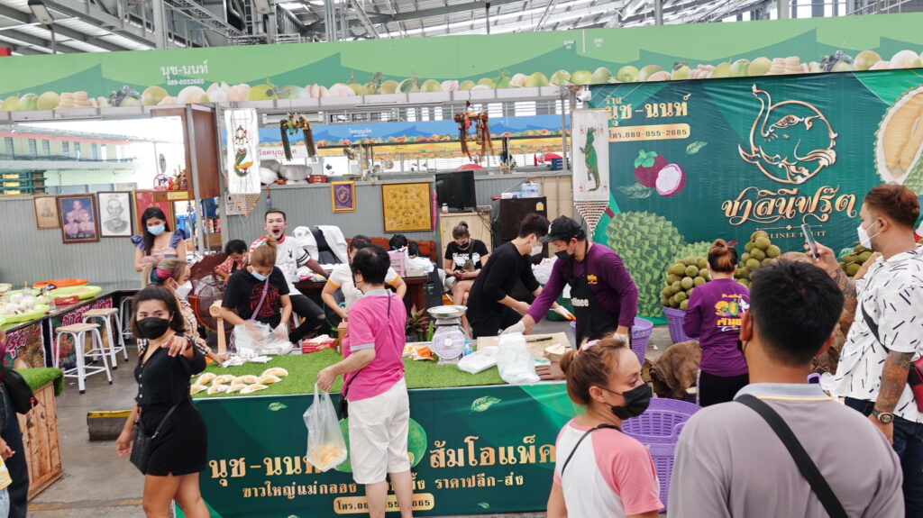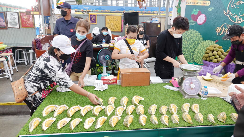 นายสมบูรณ์ วิชิต อายุ 54 ปี ชาวดอนเมือง กทม. กล่าวว่า เพื่อนได้แนะนำและได้ดูจากเพจของทางร้าน จึงได้ทราบว่าทางร้านมีโปรโมชั่นขายทุเรียนราคาถูกจึงได้เดินทางมาเข้าคิวซื้อ เมื่อดูแล้วพลว่าทุเรียนที่เรามีคุณภาพดี รวมถึงมีรสชาติที่อร่อย เบื้องต้นเตรียมเงินมาซื้อประมาณ 200-300 บาท เพราะว่าครอบครัวชอบทานทุเรียนกันมาก.