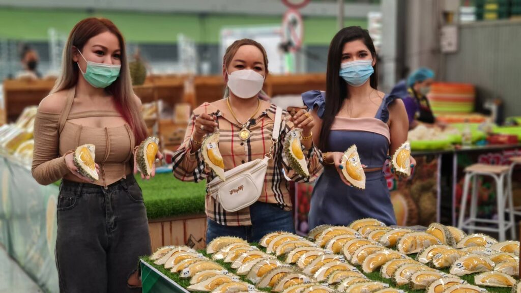 วันที่ 12 เมษายน 2565 แม่ค้าร้านทุเรียนสี่มุมเมืองจัดโปรโมชั่นเอาใจลูกค้ารายได้น้อยสู้เศรษฐกิจช่วงวิกฤตโควิด-19 ขายทุเรียนพูละ 5 บาท พร้อมเปิดสอนการขายทุเรียน การเคาะ การเลือกทุเรียน อย่างมีคณุภาพ ที่ชาลินีฟรุ๊ต ตลาดสี่มุมเมือง โซนตลาดทุเรียน 24 ชั่วโมง ตำบลคูคต อำเภอลำลูกกา จังหวัดปทุมธานี