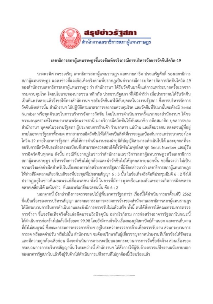 ด้วยหลัก “ความจริงย่อมมีเพียงหนึ่งเดียว” หากข้อเท็จจริงเป็นไปตามที่กรรมการตรวจการจ้างทั้ง 3 คน คำแถลงของเลขาธิการสภาผู้แทนราษฎร ที่บอกว่า “การตรวจรับไม่แล้วเสร็จ” จึงเป็นความเท็จ อันถือเป็นการกระทำความผิดทางวินัย จริยธรรม และมีการกระทำอันเป็นการเอื้อประโยชน์ให้กับเอกชน และเป็นเรื่องที่เป็นไปไม่ได้ที่นางพรพิศจะไม่รู้เรื่อง เพราะเป็นผู้อนุมัติการจ่ายเงินให้กับผู้รับจ้างในกรณีดังกล่าวเองตามระเบียบพัสดุ และผู้มีอำนาจตามกฎหมายต้องให้ความคุ้มครองกับกรรมการตรวจการจ้างทั้ง 3 คน เป็นการด่วน เนื่องจากเป็นพยานสำคัญที่สามารถให้ข้อเท็จจริงอันนำไปสู่การนำตัวผู้กระทำความผิดมาลงโทษได้ แต่หากข้อเท็จจริงเป็นไปตามที่นางพรพิศยืนยันว่า “การตรวจรับไม่แล้วเสร็จ” ก็ต้องดำเนินการกับกรรมการตรวจการจ้างทั้ง 3 คน ทั้งทางวินัยและคดีอาญา ในการทำเอกสารเท็จและรายงานเท็จต่อผู้บังคับบัญชา จนเป็นเหตุให้เกิดความเสียหายอย่างร้ายแรงต่อทางราชการและก่อให้เกิดความเสียหายอย่างร้ายแรงต่อบริษัท ซิโน-ไทย เอ็นจีเนียริ่ง แอนด์ คอนสตรัคชั่น จำกัด (มหาชน) (ผู้รับจ้าง)
