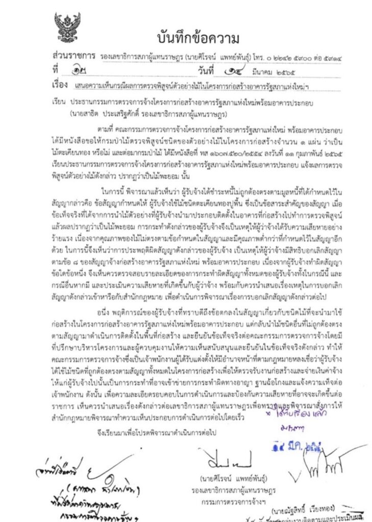 นายวัชระ กล่าวว่า สัญญาการก่อสร้างอาคารรัฐสภาแห่งใหม่ฯ สำนักงานอัยการสูงสุดได้ตรวจพิจารณาแล้ว เลขาธิการสภาผู้แทนราษฎรและผู้เกี่ยวข้อง ต้องปฏิบัติตามสัญญาและเอกสารประกอบทั้งหมดอย่างเคร่งครัด จะไปใช้อำนาจหรือดุลพินิจใด ๆ ที่ขัดหรือไม่เป็นไปตามสัญญาฯ และเอกสารประกอบที่ถือเป็นส่วนหนึ่งของสัญญาไม่ได้ งบประมาณที่ใช้ในการก่อสร้างมาจากภาษีของประชาชนทั้งประเทศ มิใช่เงินส่วนตัวของบุคคลใดบุคคลหนึ่งที่สามารถจะใช้ได้ตามอำเภอใจว่า จะจ่ายเงินให้กับใคร เพิ่มเงินค่าจ้างให้กับใคร โดยไม่ถูกต้องตามกฎหมาย กฎ ระเบียบของทางราชการและสัญญาได้ หากมีการกระทำเช่นนั้น ย่อมเป็นความผิดตามกฎหมาย เลขาธิการสภาผู้แทนราษฎร ในฐานะผู้ว่าจ้าง ย่อมเป็นผู้เสียหายที่ต้องดำเนินการตามกฎหมายกับผู้กระทำความผิด ทั้งทางอาญา แพ่ง ละเมิดกับผู้ที่กระทำความผิดในการทุจริตการก่อสร้างอาคารรัฐสภาโดยไม่ละเว้น ไม่ว่าจะมีความใกล้ชิดหรือมีความสัมพันธ์ส่วนตัวกันประการใด การละเว้นไม่ดำเนินการตามกฎหมายย่อมเป็นความผิดทางอาญาที่เลขาธิการสภาผู้แทนราษฎรจะได้รับต่อไป รวมทั้งในกรณีที่ผู้มีหน้าที่รับผิดชอบในการก่อสร้าง ต้องนำไม้ที่ถูกต้องตามชนิดที่กำหนดในสัญญาฯ มาเปลี่ยนให้ครบถ้วน เป็นหน้าที่ตามกฎหมายและสัญญาฯ ทั้งนี้ การตรวจรับงานอันเป็นเท็จไม่ว่าในขั้นตอนใดก็ตาม ผู้กระทำย่อมมีความผิดทางวินัยอย่างร้ายแรงและมีความผิดทางอาญา จึงขอให้ประธานสภาผู้แทนราษฎรพิจารณาลงโทษผู้กระทำความผิด และระงับยับยั้งความเสียหายต่อทางราชการ และภาษีอากรของประชาชนมิให้เกิดขึ้นมากเกินไปกว่านี้.
