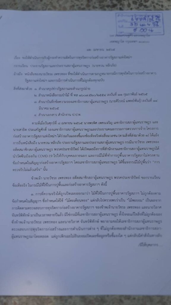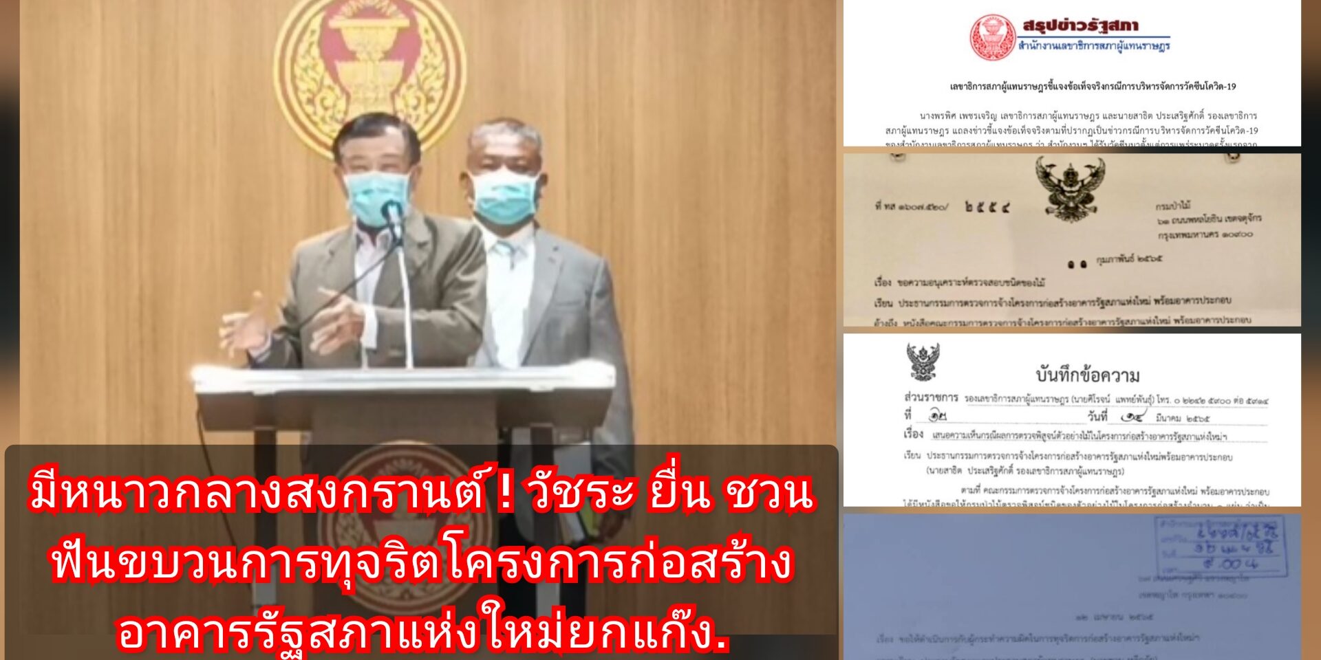 (12 เม.ย.65) ที่อาคารรัฐสภา เมื่อเวลา 9.00 น.นายวัชระ เพชรทอง อดีตส.ส.พรรคประชาธิปีตย์ ยื่นหนังสือผ่านงานสารบรรณถึงนายชวน หลีกภัย ประธานสภาผู้แทนราษฎร ขอให้ดำเนินการกับผู้กระทำความผิดในการทุจริตการก่อสร้างอาคารรัฐสภาแห่งใหม่ฯจากกรณีเมื่อวันที่ 8 เม.ย.65 นางพรพิศ เพชรเจริญ เลขาธิการสภาผู้แทนราษฎร และนายสาธิต ประเสริฐศักดิ์ รองเลขาธิการสภาผู้แทนราษฎรและประธานคณะกรรมการตรวจการจ้าง โครงการก่อสร้างอาคารรัฐสภาแห่งใหม่ฯ ได้ร่วมกันแถลงชี้แจงข้อเท็จจริงต่อสื่อมวลชน โต้แย้งการยื่นหนังสือถึง นายชวน หลีกภัย ประธานรัฐสภาและประธานสภาผู้แทนราษฎร กรณีนายวัชระ เพชรทอง อดีตส.ส.พรรคประชาธิปัตย์ ได้เปิดเผยถึงการที่สำนักงานเลขาธิการสภาผู้แทนราษฎรนำวัคซีนป้องกัน COVID-19 ไปให้กับบุคคลภายนอก และกรณีไม้ที่ทำการปูพื้นอาคารรัฐสภาไม่ตรงตามข้อกำหนดในสัญญาก่อสร้างอาคารรัฐสภาฯ โดยเลขาธิการสภาผู้แทนราษฎร ได้ชี้แจงกรณีไม้ปูพื้นว่า “การตรวจรับไม่แล้วเสร็จ” นั้น