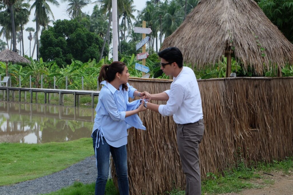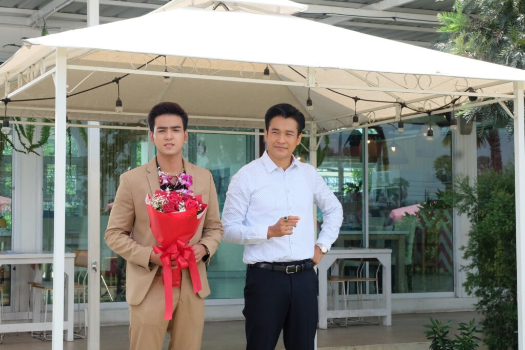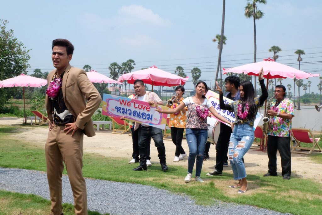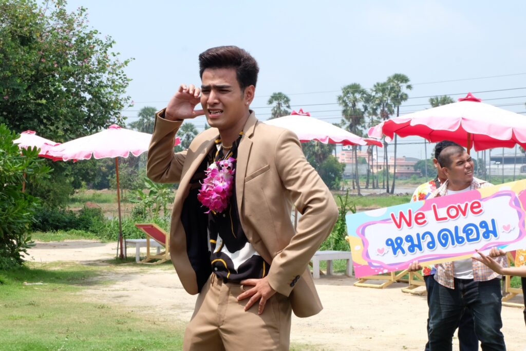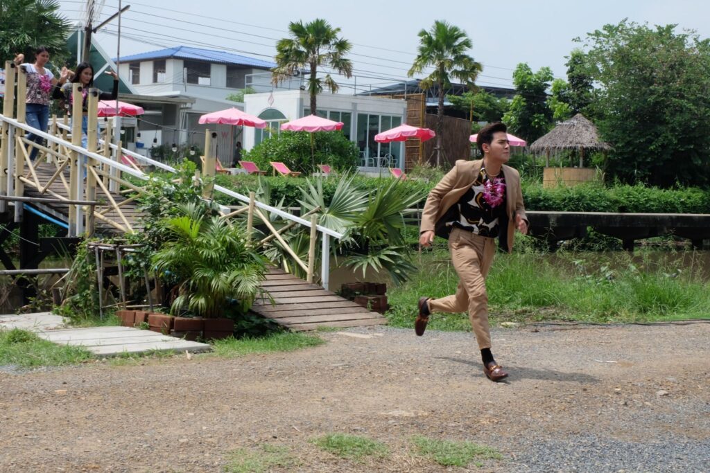 หลังจากซักซ้อมคิวกันเรียบร้อย ผู้กำกับฯ ก็เริ่มเคลื่อนกล้อง โดยทีมงานขอเก็บภาพของ เพชร และทีมแตรวง วิ่งตาม หมวดเอม จนเหนื่อยหอบ เพราะต้องวิ่งอยู่หลายรอบ ด้าน หมวดเอม นั้น ก็อาย จนต้องวิ่งหนีและไปชนกับ ภาวิน ที่เดินผ่านมาพอดี แต่ด้วยบุพเพสันนิวาสหรือเปล่า ชายเสื้อของ หมวดเอม ดันไปติดกับนาฬิกาของ ภาวิน ซะนี่ ทั้งคู่เลยต้องวิ่งหนีพร้อมกัน