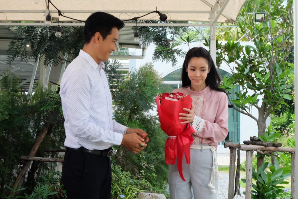 ฉากนี้ทีมงานใช้ร้านอาหารย่านปทุมธานี เป็นสถานที่ถ่ายทำ โดยเซ็ทเป็นร้านอาหารของ พลับพลึง (นุ๊ก สุทธิดา) โดยเริ่มถ่ายทำฉากแรกเป็นฉากที่ กำนันมงคล พร้อมด้วย เพชร ลูกชายมายืนมองแตรวงที่จัดเตรียมไว้ หนุ่มเพชร พร้อมช่อดอกไม้ในมือที่หวังจะมอบให้ หมวดเอม แต่กลับฝากผู้เป็นพ่อไว้ก่อน