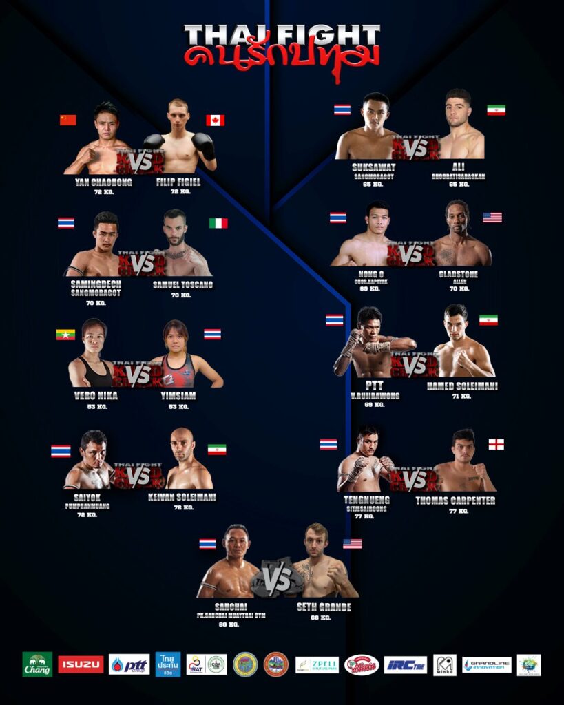 สำหรับ THAI FIGHT คนรักปทุม ร่วมส่งเสริมการท่องเที่ยว ถิ่นบัวหลวง เมืองรวงข้าว เชื้อชาวมอญ นครธรรมะ พระตำหนักรวมใจ ยังคงระดมจัดคู่มวยในรูปแบบซุปเปอร์ไฟท์สุดระทึกใจ นำโดย โคตรมวยแห่งสยาม “แสนชัย พี.เค.แสนชัยมวยไทยยิม” ปะทะ อเมริกันอันตราย “เซท เกรนด์เด” มวยจอมอึด จากสหรัฐ,“เต็งหนึ่ง ศิษย์เจ๊สายรุ้ง” พยัคฆ์ร้ายปากน้ำโพ จอมน็อคเอาท์จากนครสวรรค์ ดวล ผู้ดีจอมแกร่ง “โทมัส คาร์เพนเตอร์” มวยฝีมือดีจากอังกฤษ ขุนศอกปลิดวิญญาณ “ไทรโยค พุ่มพันธุ์ม่วง” จอมเก๋าสุดอันตาย ปะทะ เปอร์เซียพันโหด “ไควาน โซไลมานี่” มวยประสบการณ์สูง จากอิหร่าน,พร้อมทั้งคู่มวยขุนพลไทยไฟท์ อีกเพียบ ทั้ง ฉลามร้ายจากเมืองชล “ป.ต.ท. ว.รุจิรวงศ์” จอมน็อคเอาท์ลูกน้ำเค็มจากชลบุรี, ขุนศอกทะลวงฟัน “กิตติ ส.ท.แมนนครระยอง” มวยขาลุยศอกอันตราย จากจันทบุรี, จอมน็อคเอาท์ล้านนา “น้องโอ ช.ห้าพยัคฆ์” มวยกำปั้นโหด, “สมิงเดช แสงมรกต” พยัคฆ์หน้าหยก หมัดสุดคม, “เวโร ว.รุจิรวงศ์” สาวเมียนมาร์ขาโหด รวมถึงยังมีคู่มวยต่างชาติที่จะมาดวลกันในรูปแบบคาดเชือกอีกด้วย คือ “อาร์เมียร์ นาเซรี่” มวยอันตรายจากอิหร่าน แชมป์ THAI FIGHT 2019
