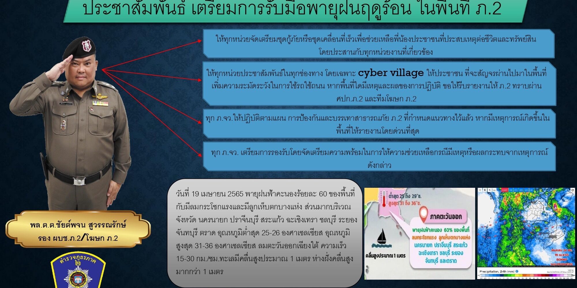 วันที่ 18 เมษายน 2565 ที่กองบัญชาการตำรวจภูธรภาค.2 จ.ชลบุรี : พล.ต.ต.ชัยพจน์ สุวรรณรักษ์ รอง ผบช.ภ.2 และโฆษก บช.ภ.2 เปิดเผยว่า จากกรณีมีการแจ้งข่าวเตือน จากกรมอุตุวิทยาประกาศว่าในวันที่ 19 เมษายน พ.ศ.2565 บริเวณความกดอากาศสูงหรือมวลอากาศเย็นกำลังปานกลางได้แผ่ลงมาปกคลุมถึงภาคตะวันออกเฉียงเหนือ ด้านตะวันออกของภาคเหนือของประเทศไทย และทะเลจีนใต้ ในขณะที่ประเทศไทยมีอากาศร้อนถึงร้อนจัด ลักษณะเช่นนี้ทำให้บริเวณดังกล่าวมีพายุฤดูร้อนเกิดขึ้น โดยมีลักษณะของพายุฝนฟ้าคะนอง ลมกระโชกแรง และมีลูกเห็บตกบางแห่ง รวมทั้งจะมีฝนตกหนักและฟ้าผ่าเกิดได้