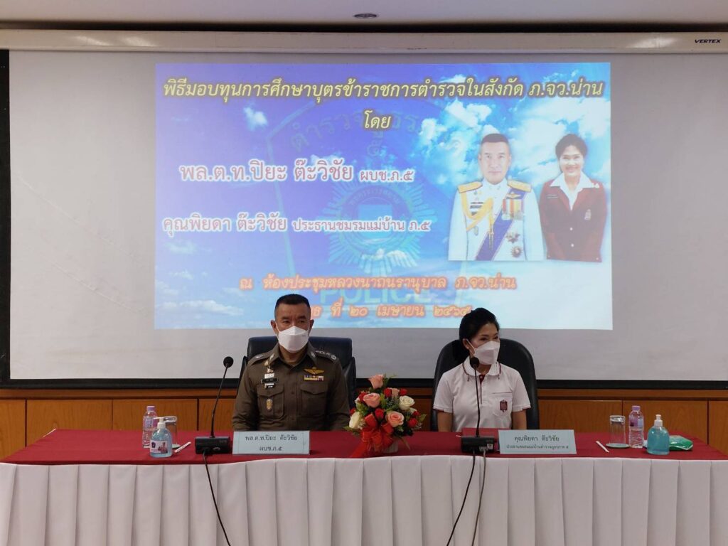 พล.ต.ท.ปิยะ ต๊ะวิชัย ผบช.ภ.5 พร้อมด้วย คุณพิยดา ต๊ะวิชัย ประธานชมรมแม่บ้านตำรวจภูธรภาค 5 ร่วมเป็นประธานในพิธีมอบทุนการศึกษาตามโครงการจัดหาทุนการศึกษาเพื่อบุตรข้าราชการตำรวจในสังกัด ภ.จว.น่าน จำนวน 57 ทุน รวมทุนการศึกษากว่า 171,000 บาท โดยแบ่งเป็น