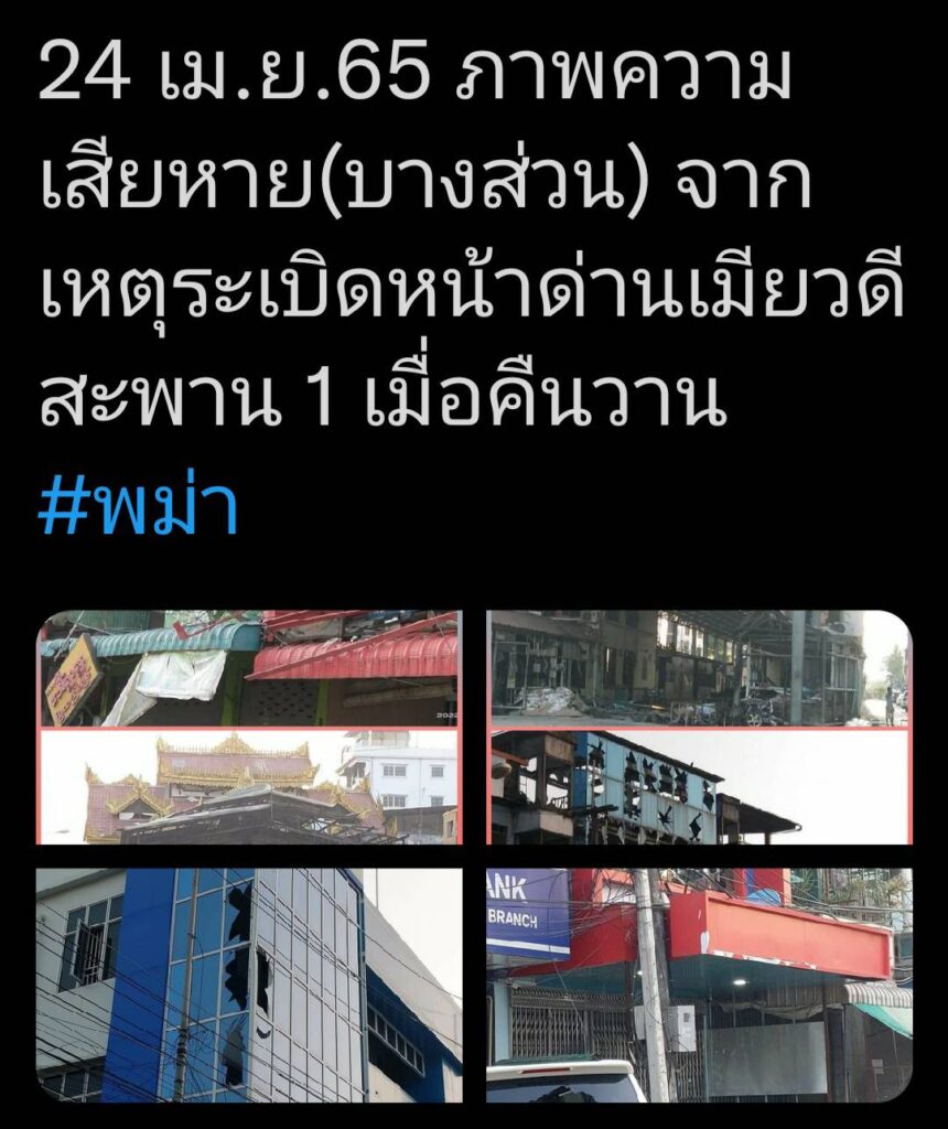 ผู้สื่อข่าวรายงานว่าเมื่อเวลา 23.00 น ของวันเสาร์ที่ 23 เมษายน 2565 เกิดเหตุระเบิดคาร์บอมที่บริเวณด่านพรมแดนเมียวดี -แม่สอด เชิงสะพานมิตรภาพไทย-เมียนมา แห่งที่ 1 ฝั่งประเทศเมียนมา รัฐกะเหรี่ยง ประเทศเมียนมา ตรงข้ามบ้านริมเมย ตำบลท่าสายลวด อ.แม่สอด จ.ตาก เสียงระเบิดดังสนั่นจนถึงตัวอ.แม่สอด ส่งผลให้เกิดไฟไหม้ตัวอาคารด่านเมืองเมียวดี และร้านค้า อาคารพาณิชย์ บริเวณด่าน มีอุปกรณ์การทำงานของเจ้าหน้าที่ได้รับความเสียหายอย่างหนัก ในที่เกิดเหตุหน้าด่านพบรถยนต์เก๋ง 1 คันได้รับความเสียหายจากแรงระเบิด และไฟไหม้ทั้งคัน คาดว่าเป็นรถยนต์ที่คนร้ายใช้ก่อเหตุ