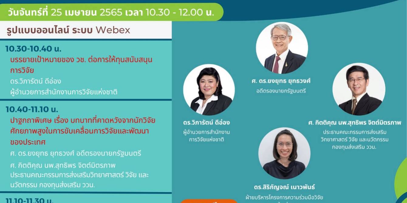 ระหว่าง สำนักงานการวิจัยแห่งชาติ (วช.) และ สำนักงานพัฒนาวิทยาศาสตร์และเทคโนโลยีแห่งชาติ (สวทช.) ในวันจันทร์ที่ 25 เมษายน 2565 เวลา 10.30 -12.00 น.