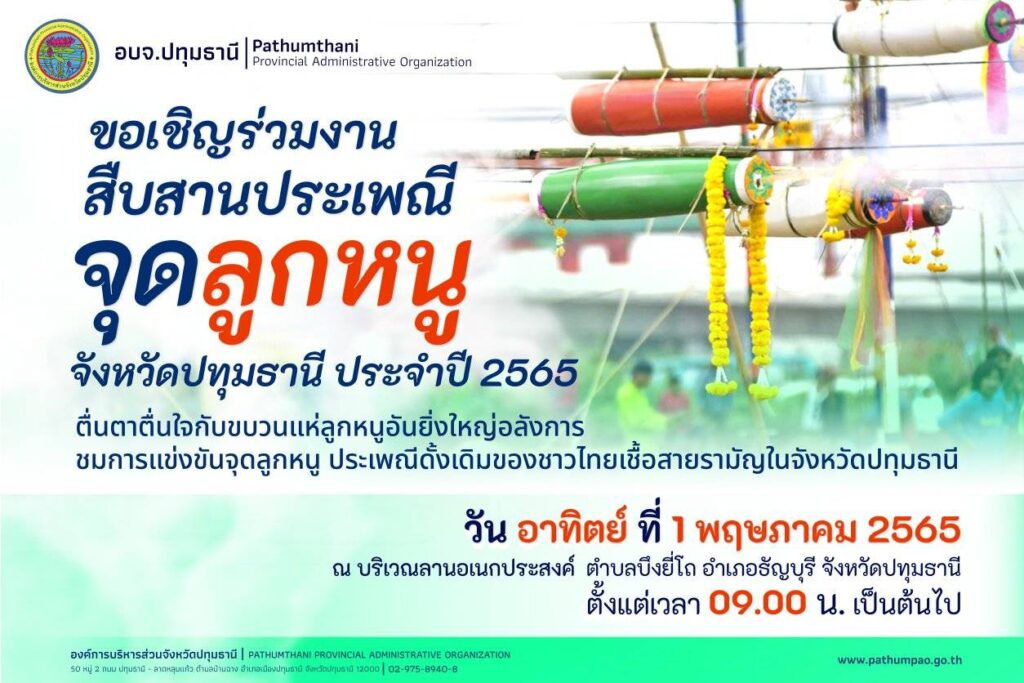 เมื่อเวลา 13.00 น. วันที่ 25 เมษายน 2565 ที่ห้องประชุมปิยลาภ (ชั้น 5 ) องค์การบริหารส่วนจังหวัดปทุมธานี ต.บ้านฉาง อ.เมือง จ.ปทุมธานี พล.ต.ท.คำรณวิทย์ ธูปกระจ่าง นายกองค์การบริหารส่วนจังหวัดปทุมธานี และ นายสุทัศน์ คงแย้ม ท่องเที่ยวและกีฬาจังหวัดปทุมธานี ร่วมแถลงข่าวเกี่ยวกับการจัดโครงการจัดงานสืบสานประเพณีจุดลูกหนูจังหวัดปทุมธานี ในวันอาทิตย์ที่ 1 พฤษภาคม 2565 บริเวณลานอเนกประสงค์ (ข้างตลาดพาเจริญคลองสี่) ตำบลบึงยี่โถ อำเภอธัญบุรี จังหวัดปทุมธานี เพื่อสืบสานภูมิปัญญาท้องถิ่น และอนุรักษ์ศิลปวัฒนธรรมประเพณีการจุดลูกหนูของชนชาวไทยเชื้อสายมอญ ในจังหวัดปทุมธานีให้คงอยู่สืบไป