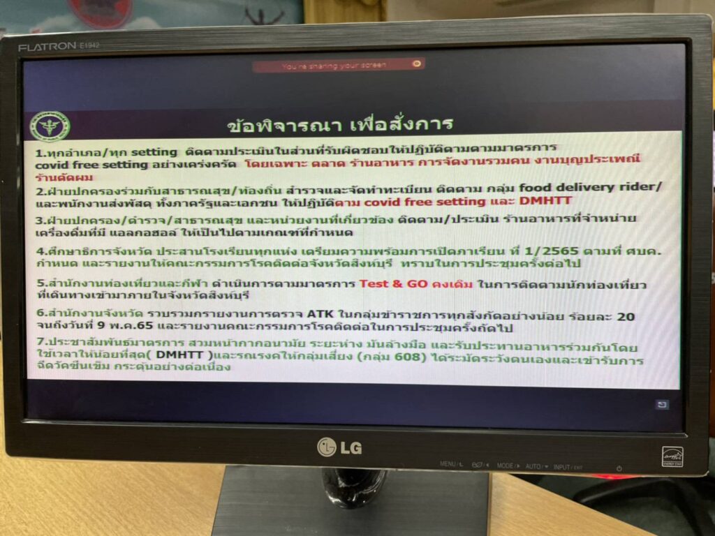 - ให้ทุกอำเภอ ติดตามและประเมินการปฎิบัติตามมาตรการ covid setting และ DMHTTใน ตลาด ร้านอาหาร การจัดงานรวมคน งานบุญประเพณี ร้านตัดผมในพื้นที่ที่รับผิดชอบ