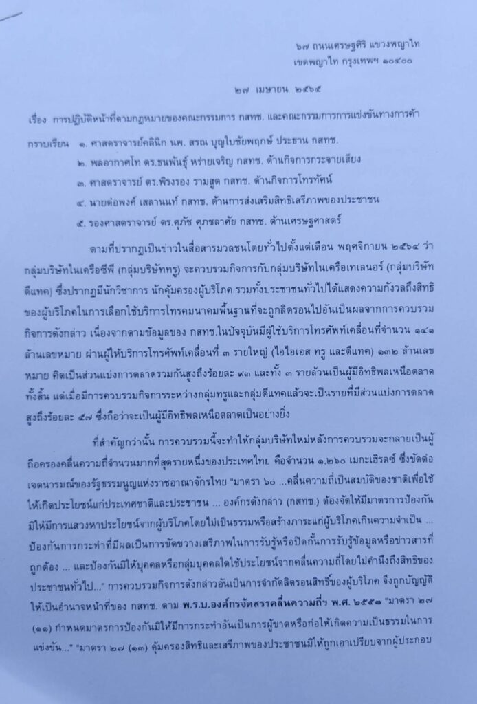 จากกรณีที่มีข่าวตั้งแต่เดือนพฤศจิกายน 2564 ว่ากลุ่มบริษัทในเครือซีพี (กลุ่มบริษัททรู) จะควบรวมกิจการกับกลุ่มบริษัทในเครือเทเลนอร์ (กลุ่มบริษัทดีแทค) ทำให้มีนักวิชาการ นักคุ้มครองผู้บริโภค รวมทั้งประชาชนทั่วไปเกิดความกังวลถึงสิทธิของผู้บริโภคในการเลือกใช้บริการโทรคมนาคมพื้นฐานที่จะถูกลิดรอนไปอันเป็นผลจากการควบรวมกิจการดังกล่าว เนื่องจากตามข้อมูลของ กสทช.ในปัจจุบันมีผู้ใช้บริการโทรศัพท์เคลื่อนที่จํานวน 141 ล้านเลขหมาย ผ่านผู้ให้บริการโทรศัพท์เคลื่อนที่ 3 รายใหญ่ (ไอไอเอส ทรู และดีแทค) 132 ล้านเลขหมาย คิดเป็นส่วนแบ่งการตลาดรวมกันสูงถึงร้อยละ 93 และทั้ง 3 รายล้วนเป็นผู้มีอิทธิพลเหนือตลาดทั้งสิ้น แต่เมื่อมีการควบรวมกิจการระหว่างกลุ่มทรูและกลุ่มดีแทคแล้วจะเป็นรายที่มีส่วนแบ่งการตลาดสูงถึงร้อยละ 57 ซึ่งถือว่าจะเป็นผู้มีอิทธิพลเหนือตลาดเป็นอย่างยิ่ง ที่สําคัญกว่านั้น การควบรวมนี้จะทําให้กลุ่มบริษัทใหม่หลังการควบรวมจะกลายเป็นผู้ถือครองคลื่นความถี่จํานวนมากที่สุดรายหนึ่งของประเทศไทยคือจํานวน 1,260 เมกะเฮิรตซ์ซึ่งขัดต่อเจตนารมณ์ของรัฐธรรมนูญแห่งราชอาณาจักรไทย “มาตรา 60 …คลื่นความถี่เป็นสมบัติของชาติเพื่อใช้ให้เกิดประโยชน์แก่ประเทศชาติและประชาชน … องค์กรดังกล่าว (กสทช.) ต้องจัดให้มีมาตรการป้องกันมิให้มีการแสวงหาประโยชน์จากผู้บริโภคโดยไม่เป็นธรรมหรือสร้างภาระแก่ผู้บริโภคเกินความจําเป็น …