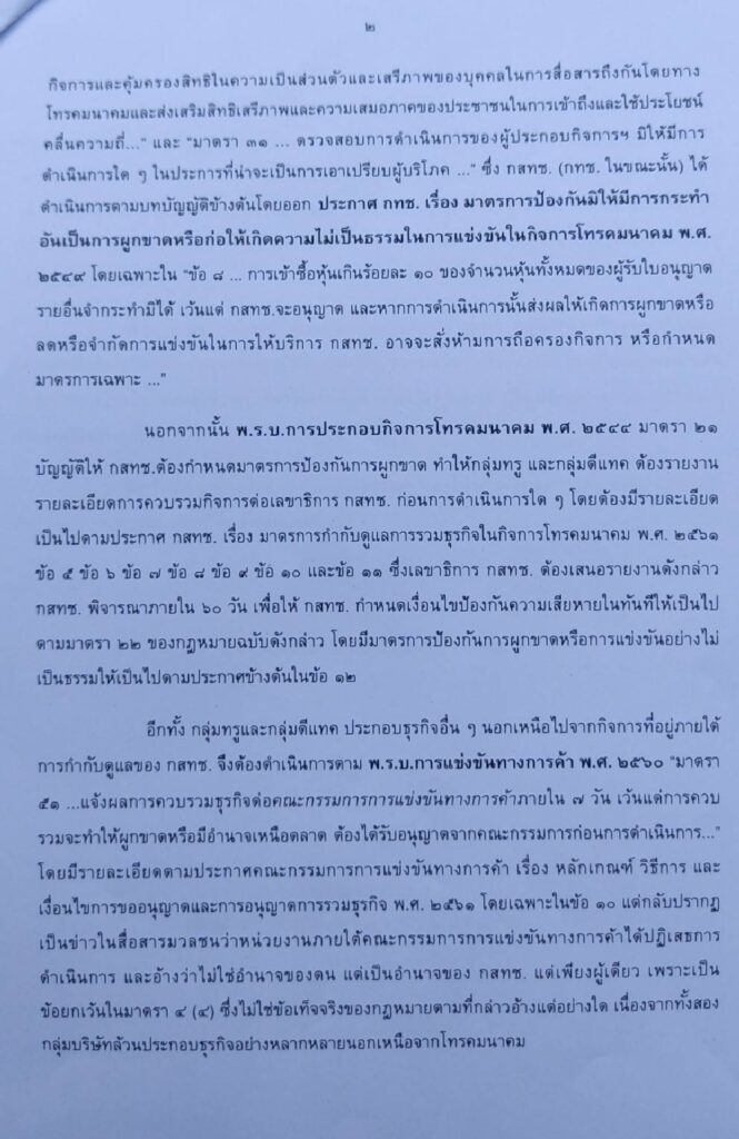 นอกจากนั้น พ.ร.บ.การประกอบกิจการโทรคมนาคม พ.ศ. 2544 มาตรา 21 บัญญัติให้ กสทช.ต้องกําหนดมาตรการป้องกันการผูกขาด ทําให้กลุ่มทรู และกลุ่มดีแทค ต้องรายงาน