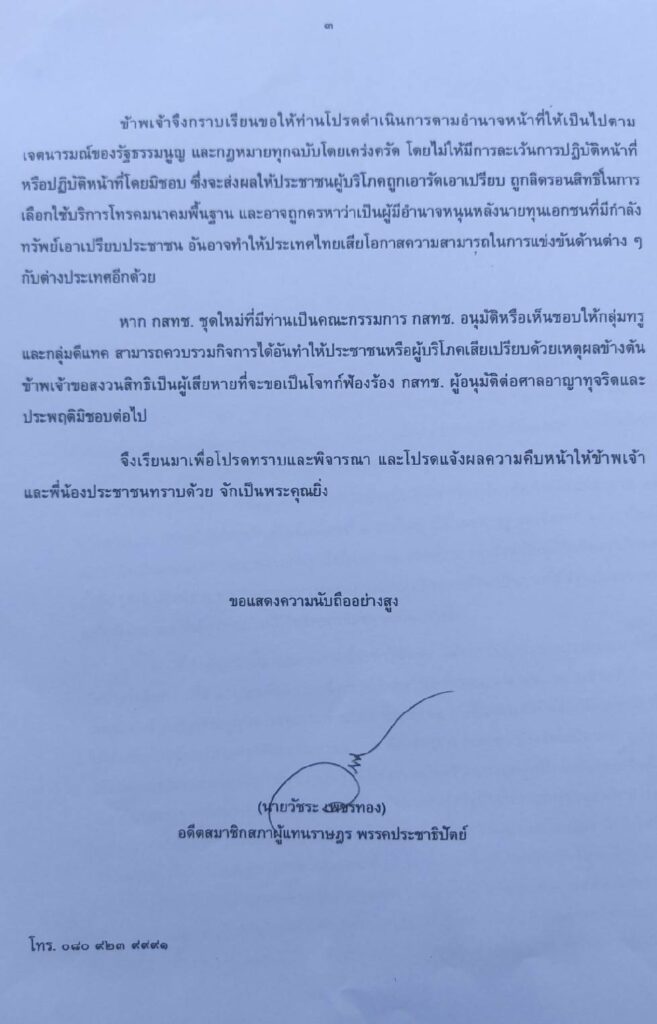 ดังนั้น จึงขอให้คณะกรรมการ กสทช.ดําเนินการตามอํานาจหน้าที่ให้เป็นไปตามเจตนารมณ์ของรัฐธรรมนูญ และกฎหมายทุกฉบับโดยเคร่งครัด ไม่ให้มีการละเว้นการปฏิบัติหน้าที่หรือปฏิบัติหน้าที่โดยมิชอบ ซึ่งจะทำให้ประชาชนผู้บริโภคถูกเอารัดเอาเปรียบ ถูกลิดรอนสิทธิ์ในการเลือกใช้บริการโทรคมนาคมพื้นฐาน และอาจถูกครหาว่าเป็นผู้มีอํานาจหนุนหลังนายทุนเอกชนที่มีกําลังทรัพย์เอาเปรียบประชาชน อันอาจทําให้ประเทศไทยเสียโอกาสความสามารถในการแข่งขันด้านต่าง ๆกับต่างประเทศอีกด้วย