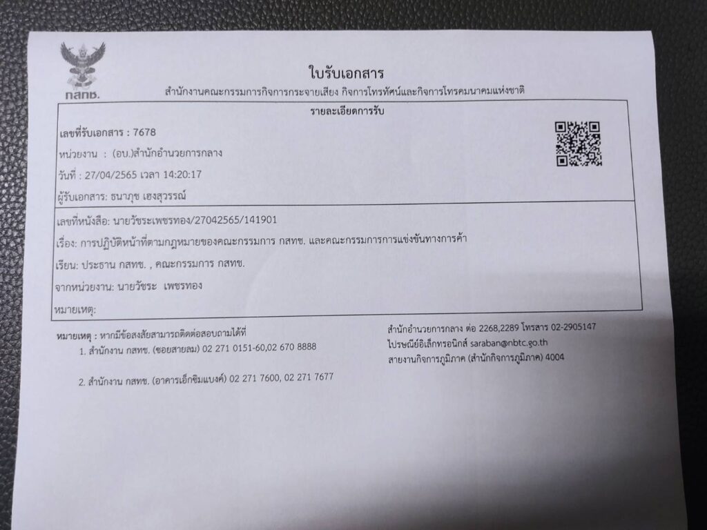 (27 เม.ย.65) เมื่อเวลา 14.20 น. ที่สำนักงาน กสทช.นายวัชระ เพชรทอง อดีตส.ส.พรรคประชาธิปัตย์ ยื่นหนังสือถึงศาสตราจารย์คลินิก นพ. สรณ บุญใบชัยพฤกษ์ ประธาน กสทช.