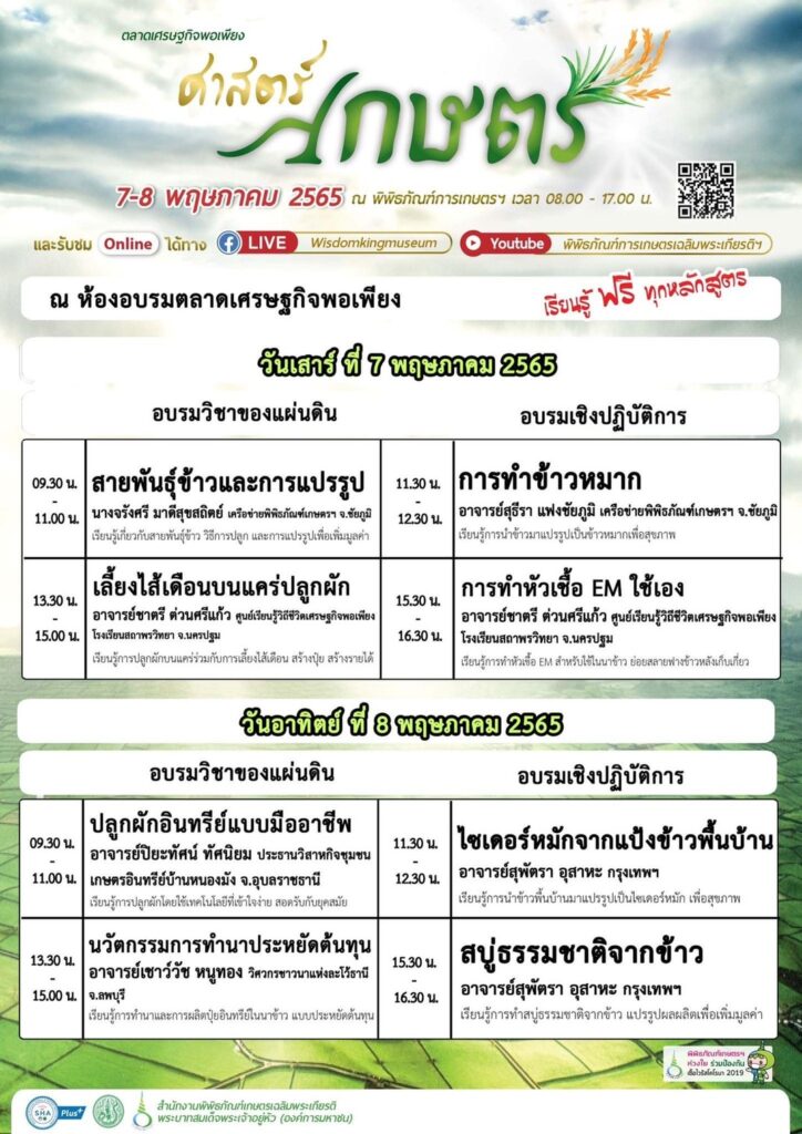 ภายในงานจัดเต็มอบรมวิชาของแผ่นดิน และอบรมเชิงปฏิบัติการ เก็บเกี่ยวองค์ความรู้ ด้านการเกษตรเศรษฐกิจพอเพียง กว่า 8 หลักสูตร อาทิ หลักสูตรสายพันธุ์ข้าวและการแปรรูป โดยอาจารย์ จรังศรี มาดีสุขสถิตย์ หลักสูตรการทำข้าวหมาก โดยอาจารย์สุธีรา แฟงชัยภูมิ ซึ่งทั้ง 2 ท่านเป็นเครือข่ายพิพิธภัณฑ์เกษตรฯ จ.ชัยภูมิ หลักสูตรนวัตกรรมการทำนาประหยัดต้นทุน โดยอาจารย์เชาว์วัช หนูทอง วิศวกรชาวนาแห่งละโว้ธานี จ.ลพบุรี หลักสูตรสบู่ธรรมชาติจากข้าว โดยอาจารย์สุพัตรา อุตสาหะ และหลักสูตรการทำหัวเชื้อ EM ใช้เอง โดยอาจารย์ชาตรี ต่วนศรีแก้ว ศูนย์เรียนรู้วิถีชีวิตเศรษฐกิจพอเพียงโรงเรียนสถาพรวิทยา จ.นครปฐม โดยเปิดให้เรียนรู้ทั้งในรูปแบบ Onsite ณ ห้องอบรมตลาดเศรษฐกิจพอเพียง ภายใต้มาตรการป้องกันการแพร่ระบาดของโรคโควิด – 19 ซึ่งจำกัดผู้เข้าร่วมอบรมจำนวน 50 คนต่อวิชา และสามารถรับชมการถ่ายทอดสด ได้ทาง Youtube พิพิธภัณฑ์การเกษตรเฉลิมพระเกียรติฯ