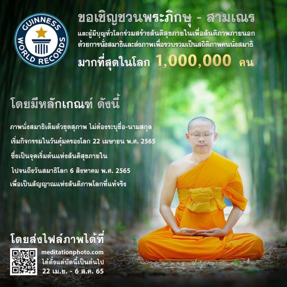 พระครูสมุห์สนิทวงศ์ กล่าวเพิ่ม “มาร่วมสร้างสถิติโลกและสร้างประวัติศาสตร์ให้กับพระพุทธศาสนา ด้วยการ นั่งสมาธิ และส่งภาพเพื่อรวบรวมเป็น “สถิติภาพคนนั่งสมาธิมากที่สุดในโลก 1 ล้านภาพ” บันทึกสถิติ Guinness world records โดยให้ถ่ายภาพนั่งสมาธิ แบบเต็มตัว ด้วยชุดสุภาพ ไม่ต้องระบุชื่อ-นามสกุล เริ่มส่งภาพได้แล้วตั้งแต่วันนี้ไปจนถึงวันสมาธิโลก 6 สิงหาคม พ.ศ. 2565 ที่ http://meditationphoto.com หรือที่ Line Open Chat : https://bit.ly/1milliongwr”