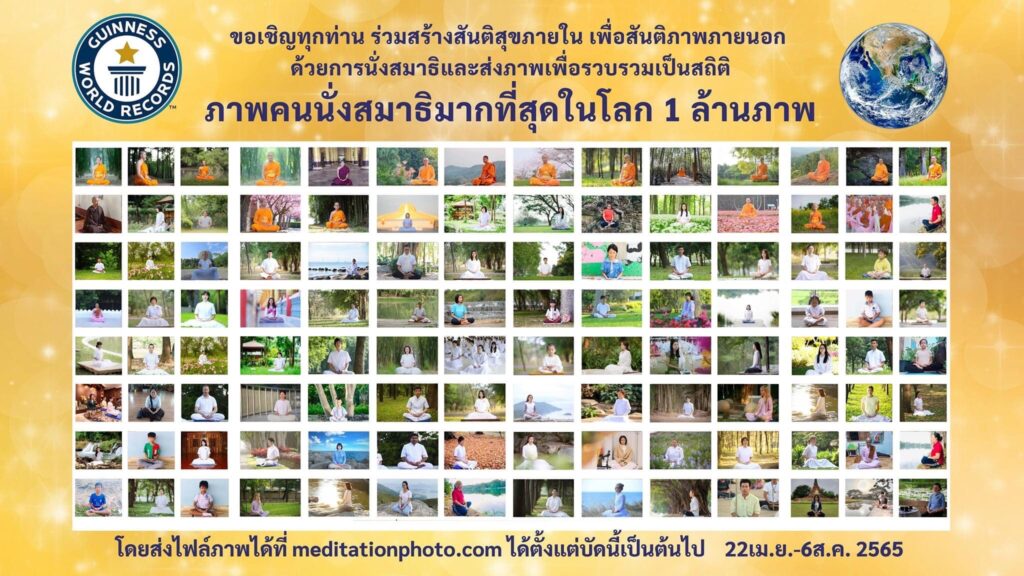 วันที่ 4 พฤษภาคม 2565 วัดพระธรรมกาย ชวนนั่งสมาธิ “4 ส. สู้ 4 ภัย” สร้างสันติสุขภายในเพื่อสันติภาพโลก และส่งภาพบันทึกสถิติกินเนสส์ เวิลด์เรคคอร์ด 1,000,000 ภาพ