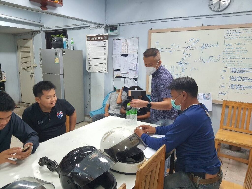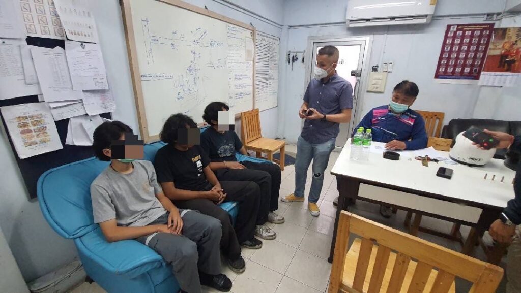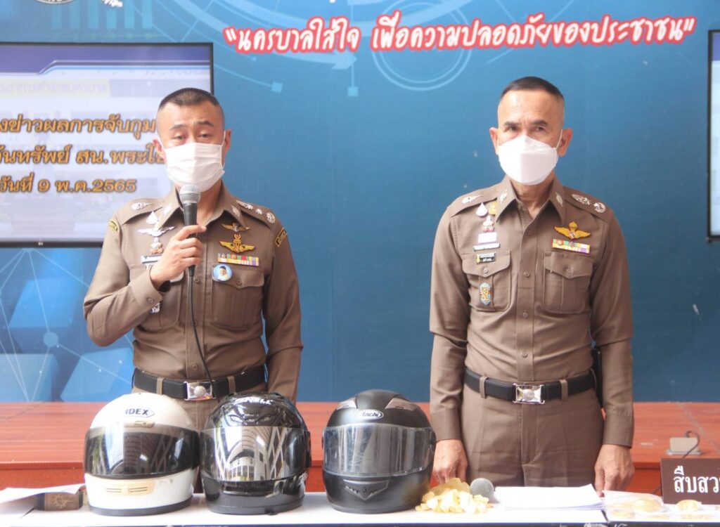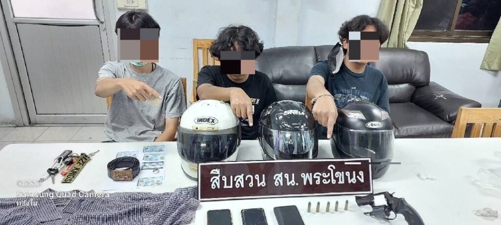พฤติการณ์กล่าวคือ เจ้าหน้าที่ตำรวจชุดสืบสวน สน.พระโขนง ได้รับแจ้งจากผู้เสียหายว่าเมื่อวันที่ 6 พ.ค.65 เวลาประมาณ 22.40 น. มีกลุ่มคนร้ายชายจำนวนสามคนขับขี่รถจักรยานยนต์มาใช้อาวุธปืนปล้นเอาทรัพย์สินของตนไปจากบริเวณริมถนนหน้าหอพักเจ วรรณแมนชั่น ซอยอ่อนนุช 44 แขวงอ่อนนุช เขตสวนหลวง กรุงเทพมหานคร เจ้าหน้าที่ตำรวจสน.พระโขนง จึงได้ออกตรวจที่เกิดเหตุ และตรวจสอบกล้องวงจรปิด พบผู้ถูกจับทั้งสามขับรถจักรยานยนต์ ของกลางเข้ามาหากลุ่มผู้เสียหาย พร้อมใช้อาวุธปืนข่มขู่เอาทรัพย์สินจากผู้เสียหาย แล้วหลบหนีไปเจ้าหน้าที่ตำรวจจึงไปตรวจสอบบริเวณที่เกิดเหตุ และตรวจสอบกล้องวงจรปิดตามเส้นทางหลบหนีของคนร้าย ต่อมาวันที่ 7 พ.ค.65 เวลาประมาณ 14.00 น. ขณะทำการสืบสวนพบเห็นผู้ต้องหาทั้งสามพร้อมรถจักรยานยนต์ จอดอยู่บริเวณบริเวณลานจอดรถบ้านเลขที่ 100 ซอยแพตาใบ (พี่งมี 50) แขวงบางจาก เขตพระโขนง กรุงเทพมหานคร และพบเห็นผู้ถูกจับทั้งสาม ลักษณะมีพิรุธมีเหตุอันควรสงสัยว่าบุคคลนั้นมีสิ่งของผิดกฎหมายอยู่ในความครอบครอง หรือซึ่งได้มาโดยการกระทำความผิด หรือซึ่งมีไว้เป็นความผิด จึงได้แสดงตัวและขอตรวจค้น โดยก่อนการตรวจค้นได้แสดงความบริสุทธิ์ใจให้ผู้ถูกจับทั้งสามดูจนเป็นที่พอใจแล้ว จึงทำการตรวจค้น จากการตรวจค้น พบของกลางลำดับที่ 1-4 อยู่ใต้เบาะรถจักรยานยนต์ของกลางลำดับที่ 5 ตรวจยึดได้ในขณะที่จอดไว้บริเวณสถานที่จับกุม,ของกลางรายการที่ 6-7 เป็นเสื้อผ้า,หมวกกันน็อค ที่ผู้ต้องหาที่ 1 สวมใส่ในขณะก่อเหตุ,ของกลางรายการที่ 8-10 เป็นเสื้อผ้า,หมวกกันน็อค ที่ผู้ต้องหาที่ 2 สวมใส่ในขณะก่อเหตุ,ของกลางรายการที่ 11-13 เป็นเสื้อผ้า,หมวกกันน็อค ที่ผู้ต้องหาที่ 3 สวมใส่ในขณะก่อเหตุ ตรวจยึดได้ในขณะผู้ต้องหาสวมใส่อยู่,สอบถามเกี่ยวกับของกลาง ผู้ถูกจับทั้งสามรับว่า เข็มขัดและแหวนเป็นทรัพย์ที่ได้มาจากการปล้นทรัพย์จริง,อาวุธปืน,รถจักรยานยนต์,เสื้อผ้า,หมวกกันน็อค เป็นอุปกรณ์ที่ใช้ในการกระทำผิดจริง เมื่อนำภาพถ่ายจากกล้องวงจรปิดให้ผู้ถูกจับดูรับว่าเป็นบุคคลในภาพจริง จึงได้แจ้งข้อกล่าวหาข้างต้นให้ทราบและส่ง พงส.สน.พระโขนง ดำเนินคดีตามกฎหมายต่อไป จากตรวจสอบประวัติต้องหาคดี ทั้ง 3 คนไม่พบประวัติการต้องโทษแต่อย่างใด