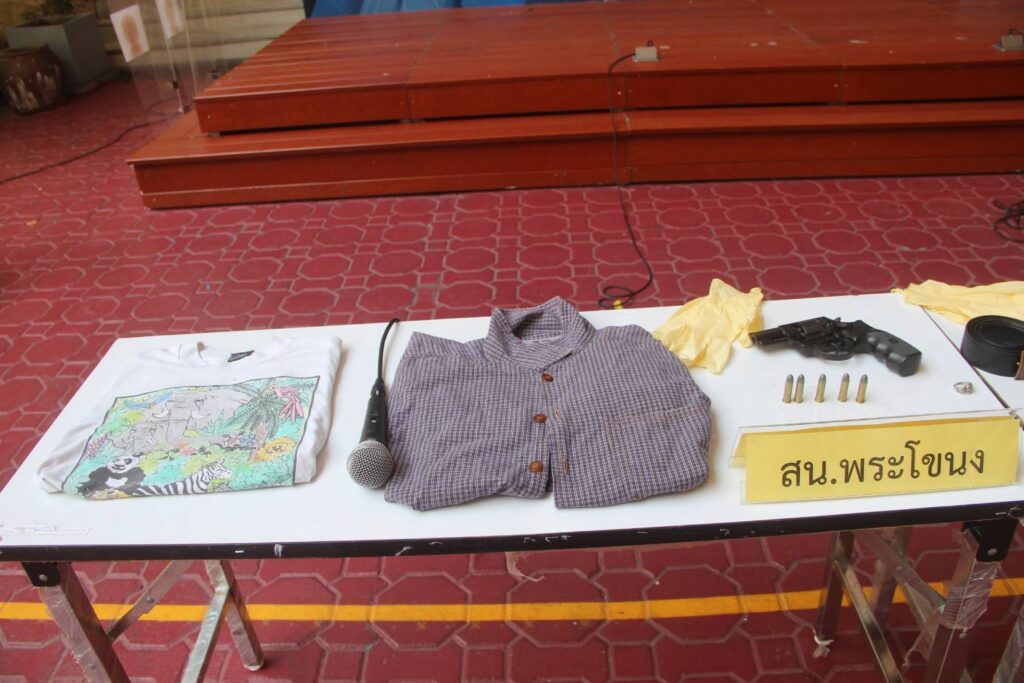 พร้อมด้วยของกลางตรวจยึดในคดีคือ เข็มขัดหนังสีดำ หัวโลหะสัญลักณณ์ Bangkapi tech จำนวน 1 เส้น,แหวนเงินหัวแหวนสัญลักษณ์เทคโนบางกะปิ จำนวน 1 วง,อาวุธปืนไทยประดิษฐ์ ขนาด.38 นิ้ว จำนวน 1 กระบอก,เครื่องกระสุนปืน ขนาด .38 นิ้ว จำนวน 5 นัด,รถจักรยานยนต์ยี่ห้อ ยามาฮ่า รุ่น เอ็นเม็กซ์ สีขาว จำนวน 1 คัน,หมวกกันน็อคเต็มใบสีขาว ยี่ห้อ index จำนวน 1 ใบ,กางเกงขายาวสีดำ จำนวน 1 ตัว,หมวกกันน็อคเต็มใบสีดำ ยี่ห้อ snell จำนวน 1 ใบ,เสื้อเชิ๊ตแขนสั้นลายสก๊อตสีม่วง จำนวน 1 ตัว,กางเกงขายาวสีดำ จำนวน 1 ตัว,หมวกกันน็อคเต็มใบสีดำ ยี่ห้อ anchi จำนวน 1 ใบ,เสื้อยืดคอกลมแขนสั้นสีขาว จำนวน 1 ตัว และกางเกงขายาวสีเทา จำนวน 1 ตัว