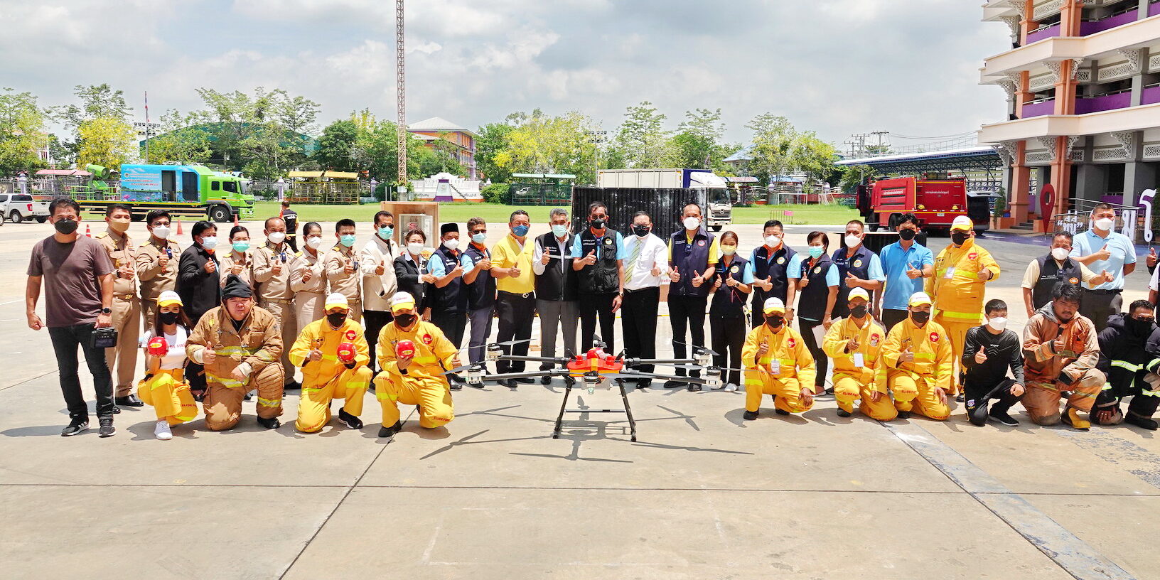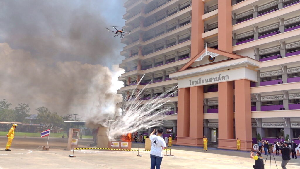 ทดสอบประสิทธิภาพการดับเพลิงอัตโนมัติและระงับเพลิง โดย พล.ต.ท.คำรณวิทย์ ธูปกระจ่าง นายก อบจ.ปทุมธานี เป็นผู้โยนลูกบอลดับเพลิงอัตโนมัติเข้าฐานเพลิงทดสอบประสิทธิภาพการเฝ้าระวังดับเพลิงอัตโนมัติ เพลิงที่เกิดจากไฟฟ้าลัดวงจร ทดสอบประสิทธิภาพการดับเพลิงอัตโนมัติร่วมกับโดรนอากาศยานไร้คนขับบรรจุลูกบอลดับเพลิง 2 ลูก (สามารถรับน้ำหนักลูกบอลได้ 30 ลูก) เมื่อเห็นควันไฟโดรนจะปล่อยลูกบอลดับเพลิงลงฐานเพลิงเพื่อดับเพลิงขั้นต้นก่อนลุกลามเป็นไฟใหญ่