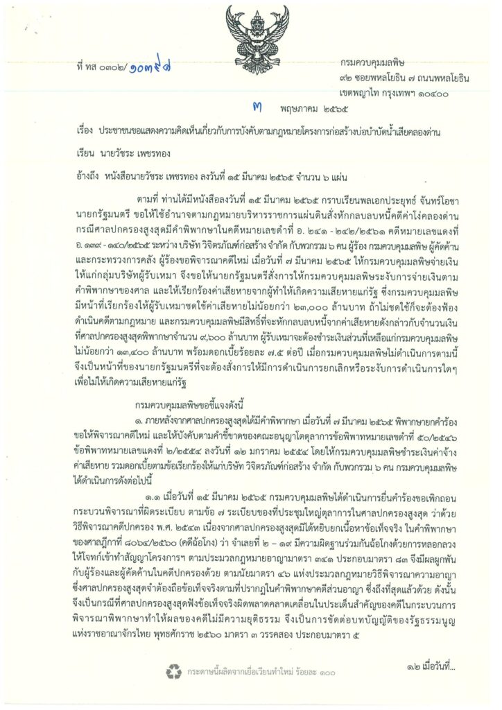 (10 พ.ค.65 )จากกรณีที่นายวัชระ เพชรทอง อดีตส.ส.พรรคประชาธิปัตย์ มีหนังสือเมื่อวันที่ 15 มี.ค.65 ถึงพล.อ.ประยุทธ์ จันทร์โอชา นายกรัฐมนตรี ขอให้ใช้อำนาจตามกฎหมายบริหารราชการแผ่นดินสั่งหักกลบลบหนี้คดีค่าโง่คลองด่าน กรณีศาลปกครองสูงสุดมีคำพิพากษาในคดีหมายเลขดำที่ อ. 241-242/2561 คดีหมายเลขแดงที่ อ. 139 – 140/2565 ระหว่างบริษัทวิจิตรภัณฑ์ก่อสร้าง จำกัด กับพวกรวม 5 คน ผู้ร้อง กรมควบคุมมลพิษ ผู้คัดค้าน และกระทรวงการคลัง ผู้ร้องขอพิจารณาคดีใหม่ เมื่อวันที่ 7 มี.ค.65ให้กรมควบคุมมลพิษจ่ายเงินให้กลุ่มบริษัทผู้รับเหมา โดยขอให้นายกรัฐมนตรีสั่งการให้กรมควบคุมมลพิษระงับการจ่ายเงินตามคำพิพากษาของศาล และให้เรียกร้องค่าเสียหายจากผู้ทำให้เกิดความเสียหายแก่รัฐ ซึ่งกรมควบคุมมลพิษ มีหน้าที่เรียกร้องให้ผู้รับเหมาชดใช้ค่าเสียหายไม่น้อยกว่า 23,000 ล้านบาท ถ้าไม่ชดใช้ก็จะต้องฟ้องดำเนินคดีตามกฎหมาย และกรมควบคุมมลพิษมีสิทธิ์ที่จะหักกลบลบหนี้จากค่าเสียหายดังกล่าวกับจำนวนเงินที่ศาลปกครองสูงสุดพิพากษาจำนวน 4,500 ล้านบาท ผู้รับเหมาจะต้องชำระเงินส่วนที่เหลือแก่กรมควบคุมมลพิษไม่น้อยกว่า 13,400 ล้านบาท พร้อมดอกเบี้ยร้อยละ 7.5 ต่อปี หากกรมควบคุมมลพิษไม่ดำเนินการตามนี้ จึงเป็นหน้าที่ของนายกรัฐมนตรีที่จะต้องสั่งการให้มีการดำเนินการยกเลิกหรือระงับการดำเนินการใดๆ เพื่อไม่ให้เกิดความเสียหายแก่รัฐนั้น