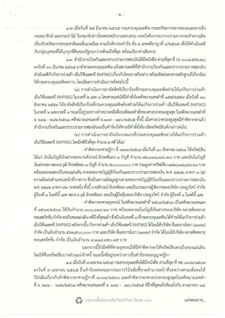 - คำพิพากษาศาลฎีกา เมื่อวันที่ 10ส.ค.64 ให้ทรัพย์สินคือเงินในบัญชีเงินฝากของนายสังวรณ์ ลิปตพัลลภ 1 บัญชี จำนวนกว่า72ล้านบาท และเงินในบัญชี เงินฝากของ พล.ต.อ.วุฒิ ลิปตพัลลภ 1 บัญชี จำนวน 50 ล้านบาท รวมมูลค่าทรัพย์สินกว่า 122 ล้านบาท พร้อมดอกผลตกเป็นของแผ่นดิน ตามพรบ.ป้องกันและปราบปรามการฟอกเงิน พ.ศ. 2542 มาตรา 3 (5)ความผิดต่อตำแหน่งหน้าที่ราชการ ทั้งนี้ นายสังวรณ์เคยเป็นกก.ผจก.ของบริษัท ประยูรวิศว์ จำกัด ผู้ร้องที่ 3 ในคดีนี้ และ พล.ต.อ.วุฒิ ลิปตพัลลภ เคยเป็นผู้ถือหุ้นของบริษัท ประยูรวิศว์ จำกัด ผู้ร้องที่ 3 ในคดีนี้ และยังมีคำพิพากษาศาลอุทธรณ์ ให้เงินจำนวนกว่า 3 แสนบาท พร้อมดอกผลในบัญชีเงินฝากของบริษัท คลาสสิคคลาส คอนสตรัคชั่น จำกัด ตกเป็นของแผ่นดิน ซึ่งคดีถึงที่สุดแล้ว ซึ่งเป็นเงินงวดที่ 1 ที่กรมควบคุมมลพิษได้ชำระให้แก่กิจการร่วมค้า เอ็นวีพีเอสเคจี (NVPSKG) หลังจากนั้น กิจการร่วมค้า เอ็นวีพีเอสเคจี (NVPSKG) ได้โอนให้บริษัท สี่แสงการโยธา จำกัด เป็นเงินจำนวน กว่า 560 ล้านบาท และบริษัท สี่แสงการโยธา จำกัด ได้โอนให้บริษัท คลาสสิคคลาส คอนสตรัคชั่น จำกัด เป็นเงินจำนวนกว่า 4ล้านบาท