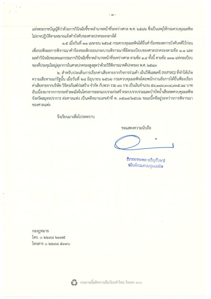 ต่อมาเมื่อวันที่ 7 เม.ย.65 กรมควบคุมมลพิษได้มีหนังสือด่วนที่สุด ยื่นคำร้องต่อคณะกรรมการวินิจฉัยชี้ขาดอำนาจหน้าที่ระหว่างศาลเพื่อขอให้วินิจฉัยเกี่ยวกับคำพิพากษาศาลฎีกาที่ 8064/2560 และคำพิพากษาศาลปกครองสูงสุดในคดีหมายเลขดำ ที่ อ. 241- 242/2561 คดีหมายเลขแดงที่ อ. 139-140/2565 ที่ถึงที่สุดแล้วขัดแย้งกัน ตามมาตรา 14แห่งพรบ.ว่าด้วยการวินิจฉัยชี้ขาดอำนาจหน้าที่ระหว่างศาล พ.ศ. 2542 ซึ่งเป็นเหตุให้กรมควบคุมมลพิษ ไม่อาจปฏิบัติตามหมายแจ้งคำบังคับของศาลปกครองกลางได้